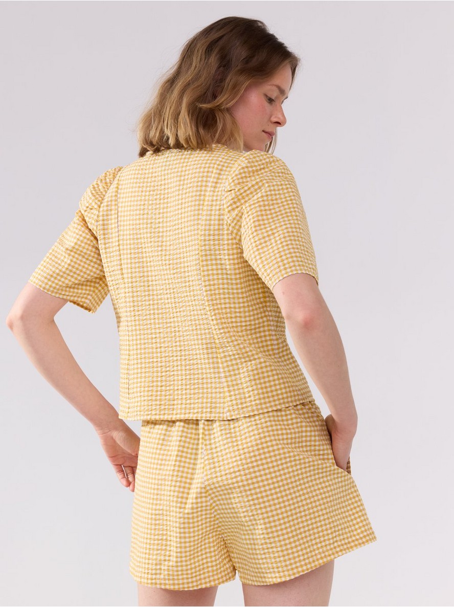 Bluza od seersuckera sa kratkim rukavima i trakama za vezivanje sprijeda.