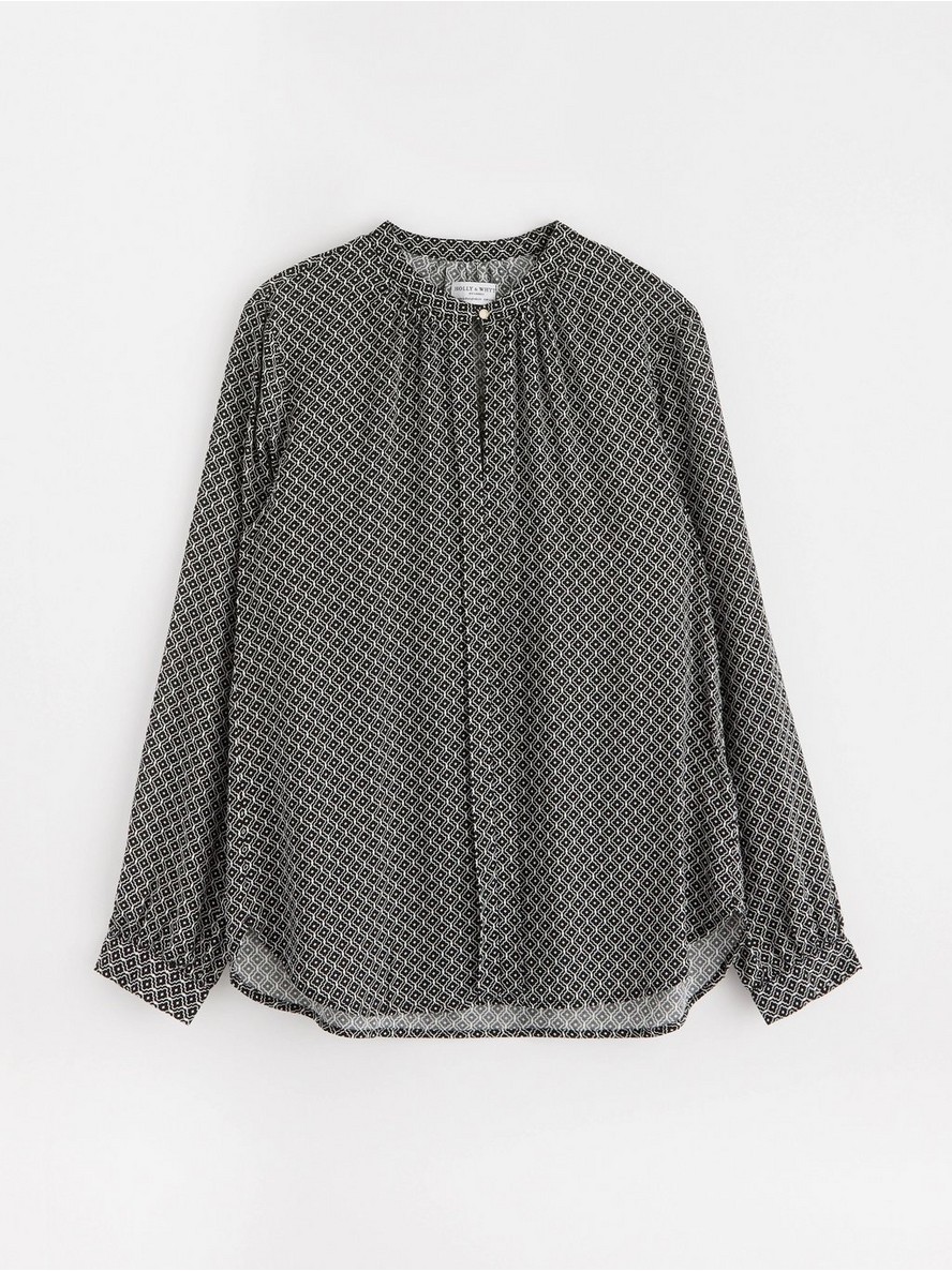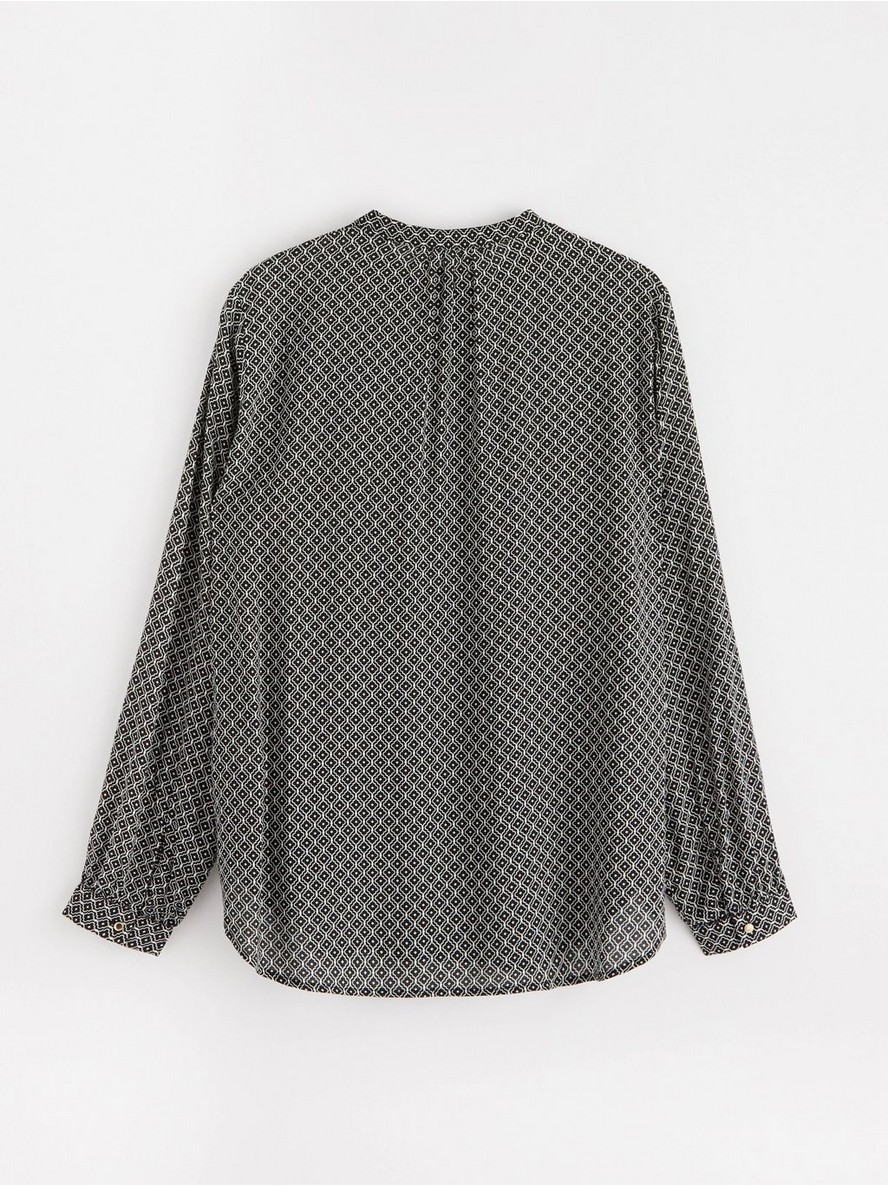 Bluza dugih rukava od tkanog materijala od viskoze, sa stojećom kragnom, izrezom na prednjem delu, zaobljenim donjim rubom i manžetnama na dugmad.