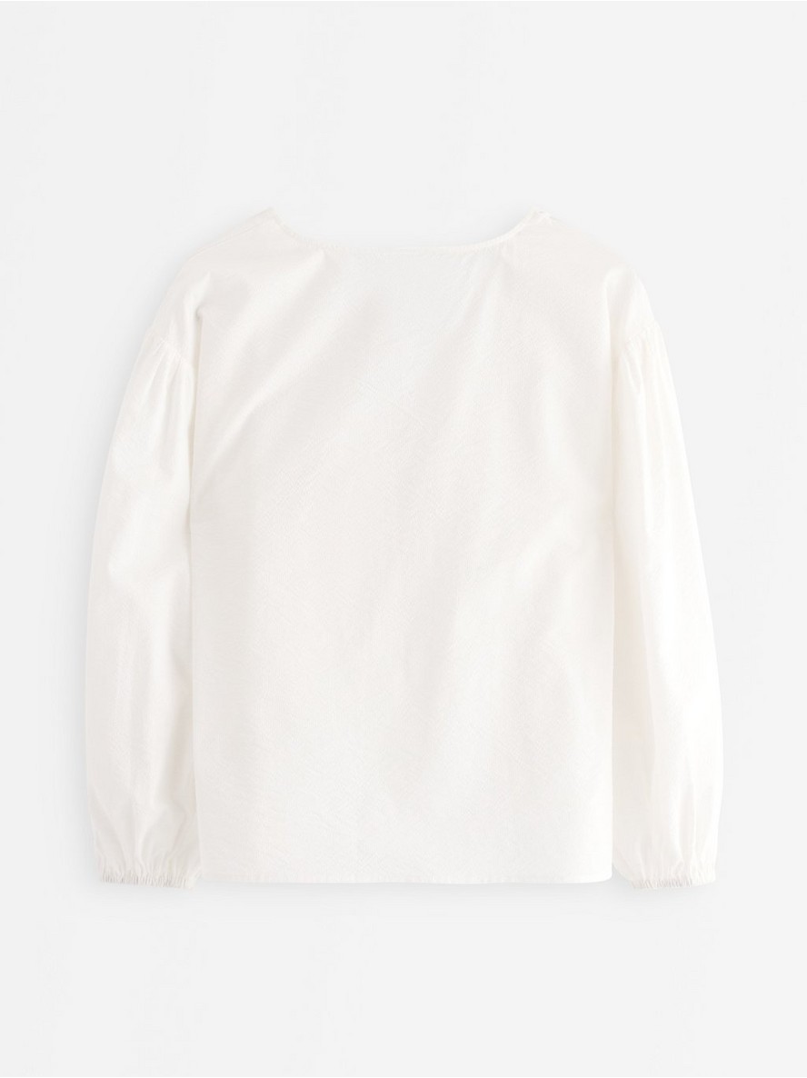 Utkana bluza od čvrstog pamuka sa teksturom, dugim balon rukavima i trakama za vezivanje sprijeda.