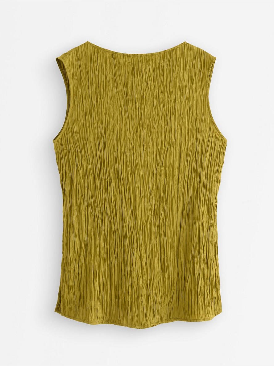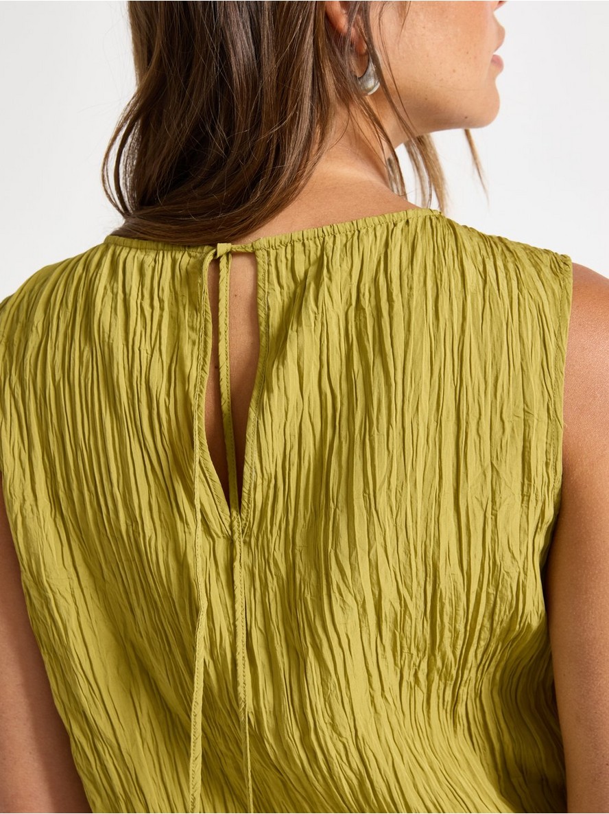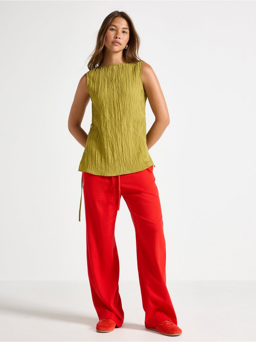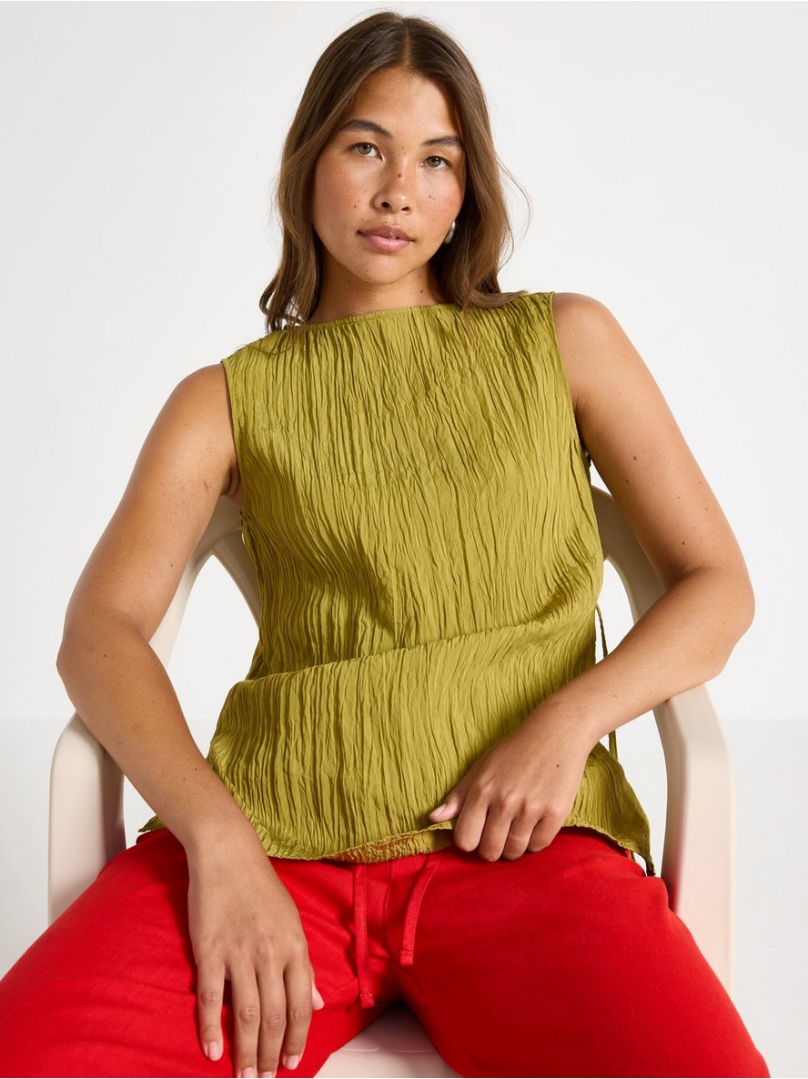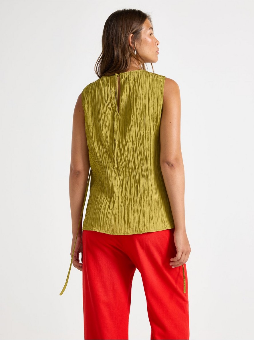 Naborana bluza bez rukava sa izrezom na čamac i detaljima za vezivanje.