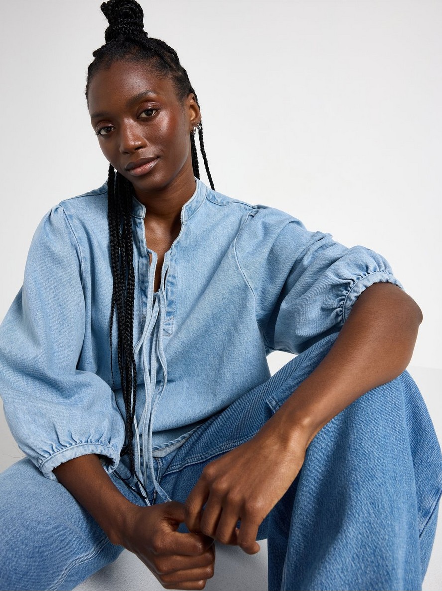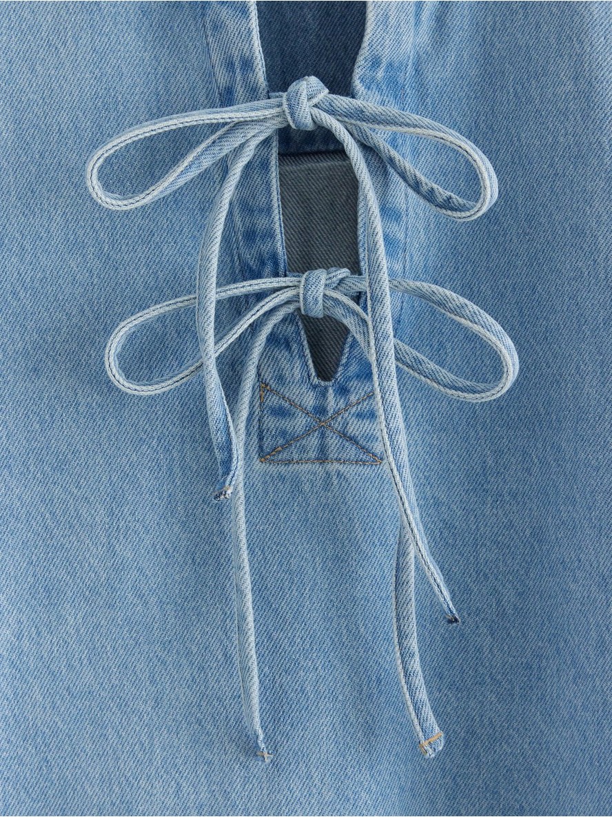 Bluza od mekanog denima sa rukavima dužine 3/4, V-izrezom i trakama za vezivanje na prednjem delu.