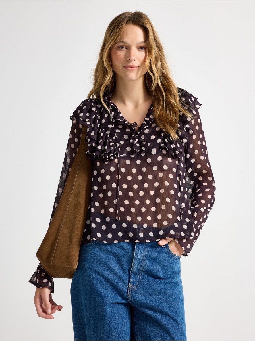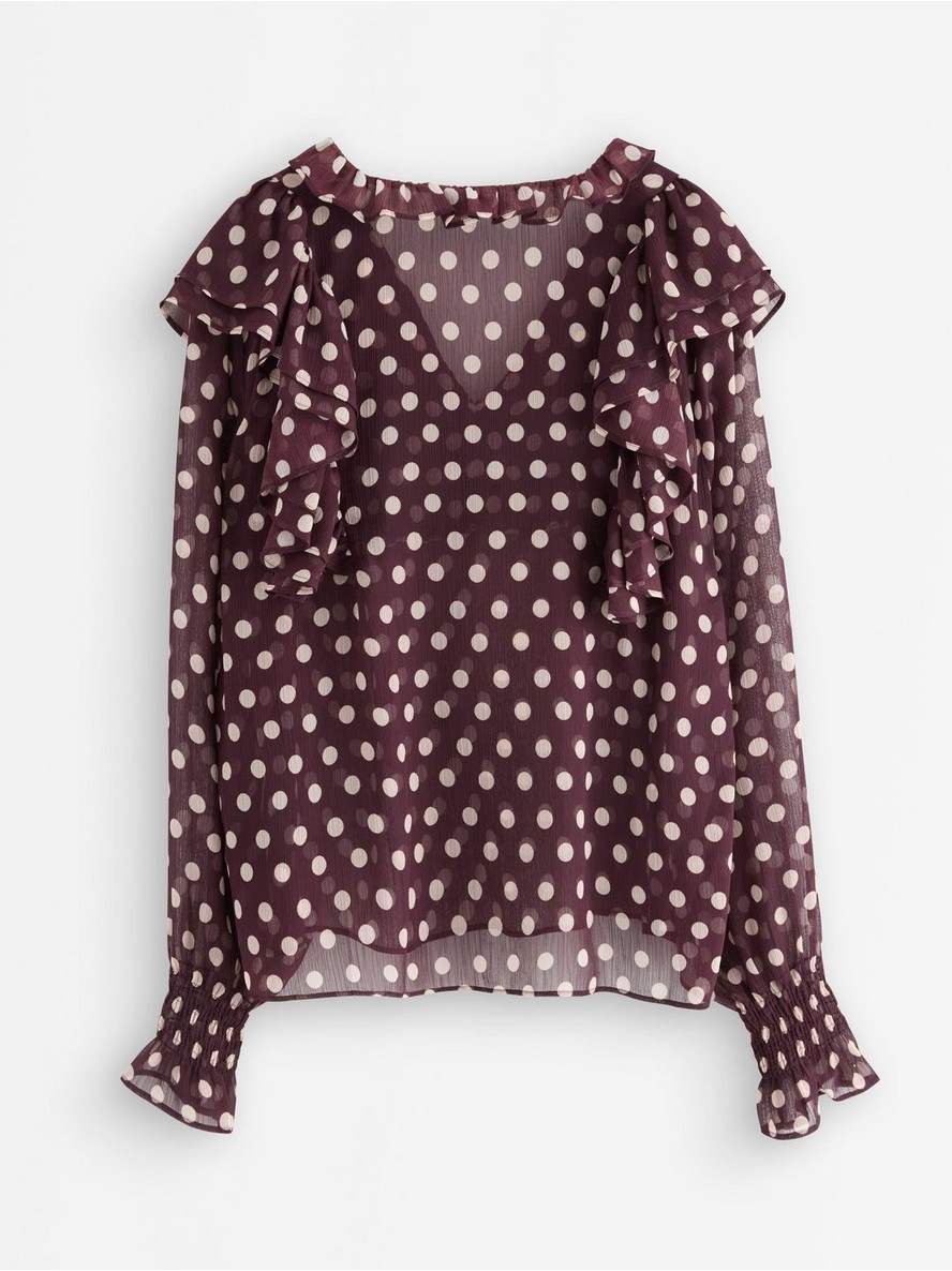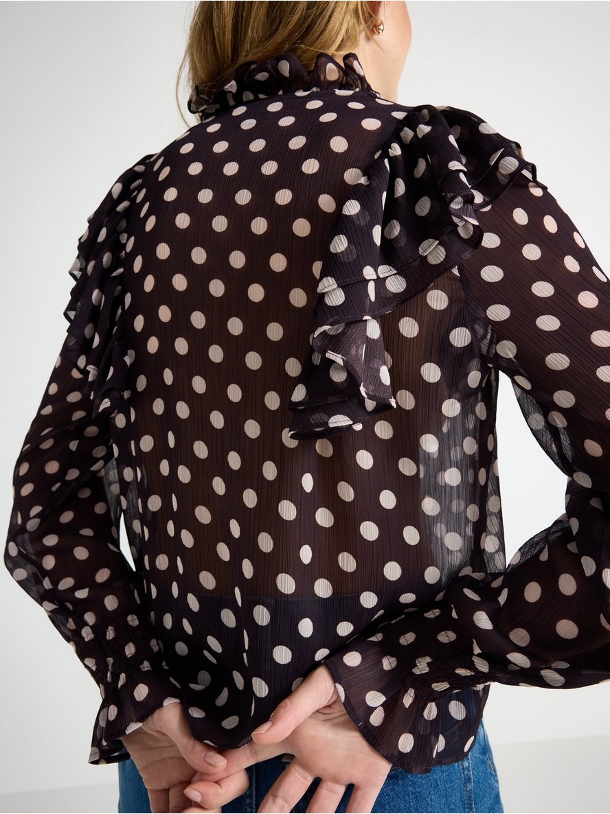 Bluza s dugim rukavima od šifona, ukrašena volanima.