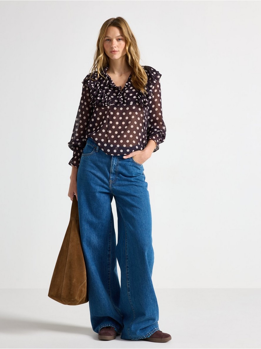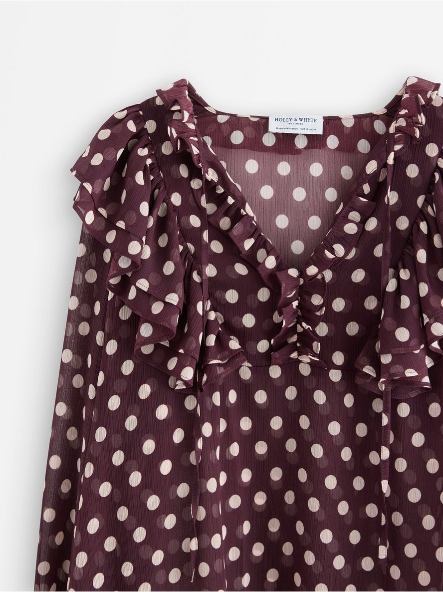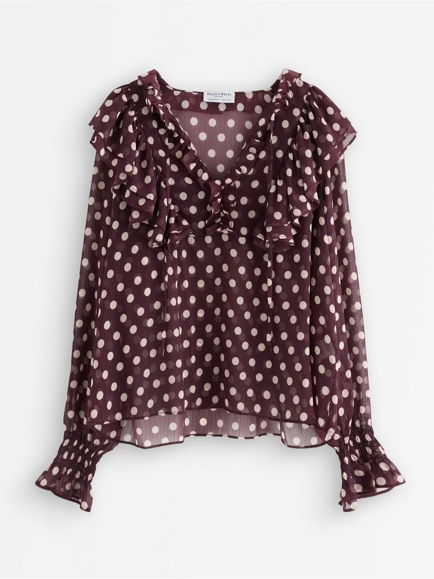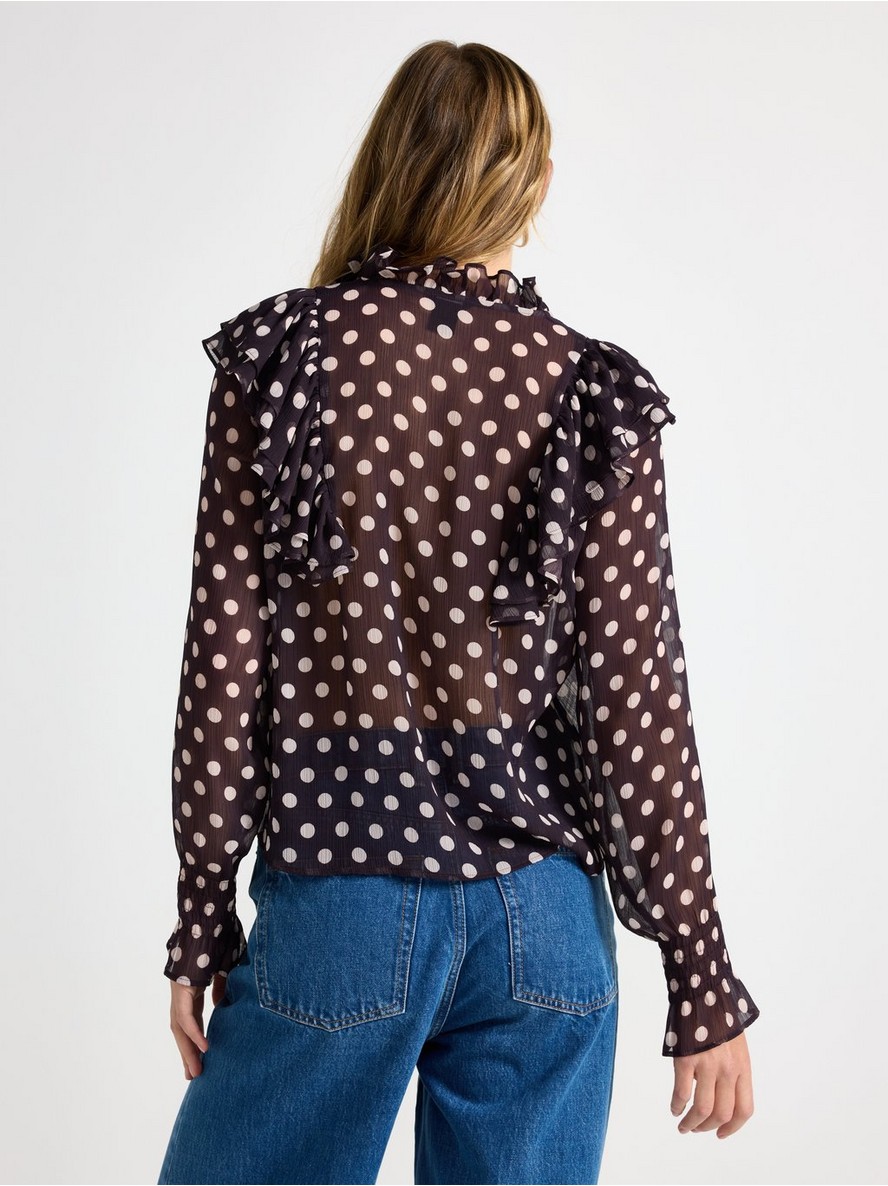 Bluza s dugim rukavima od šifona, ukrašena volanima.