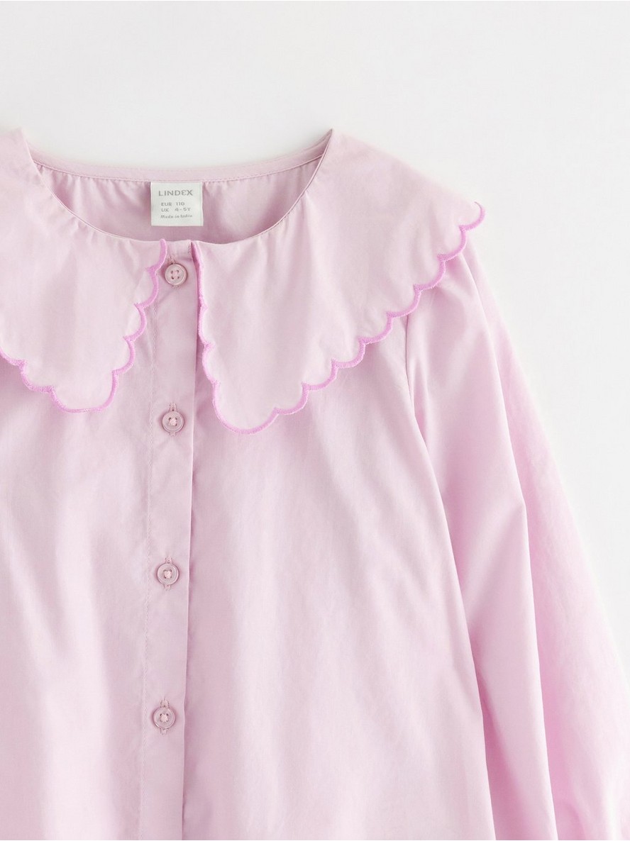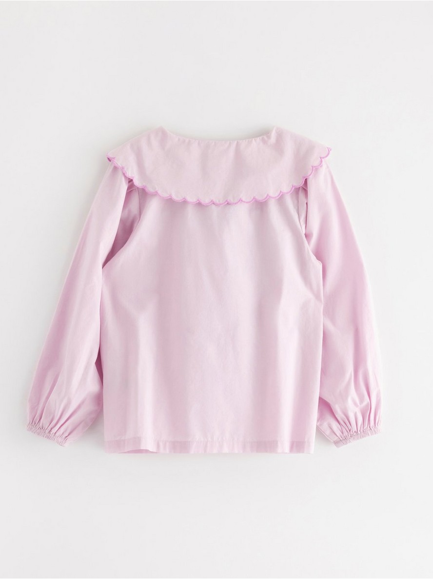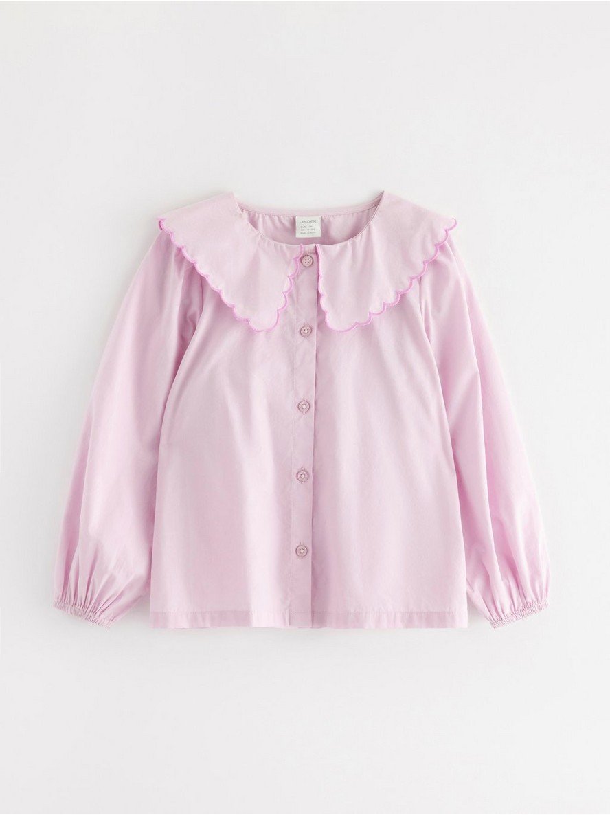 Bluza dugih rukava sa velikom kragnom i zakopčavanjem na dugmad.