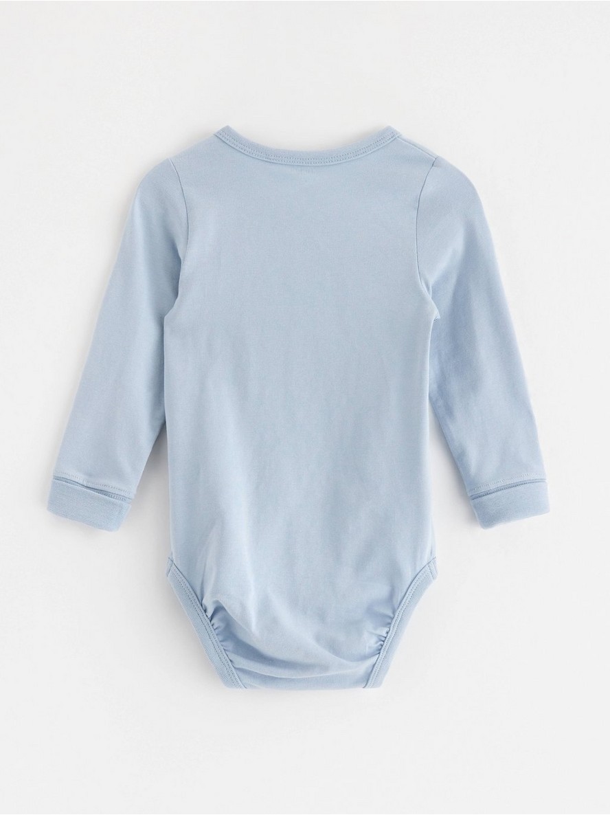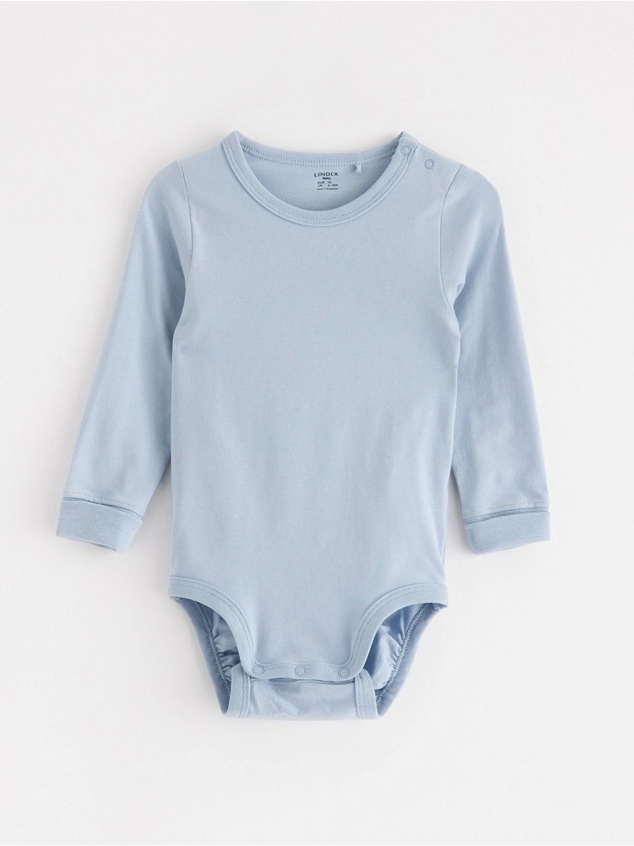 Bodi za bebe od pamučnog džersija sa dugim rukavima i kopčanjem na drukere. Sa našim pametnim rešenjem „Extended size“ beba može porasti za jednu veličinu i i dalje nositi isti komad odeće.