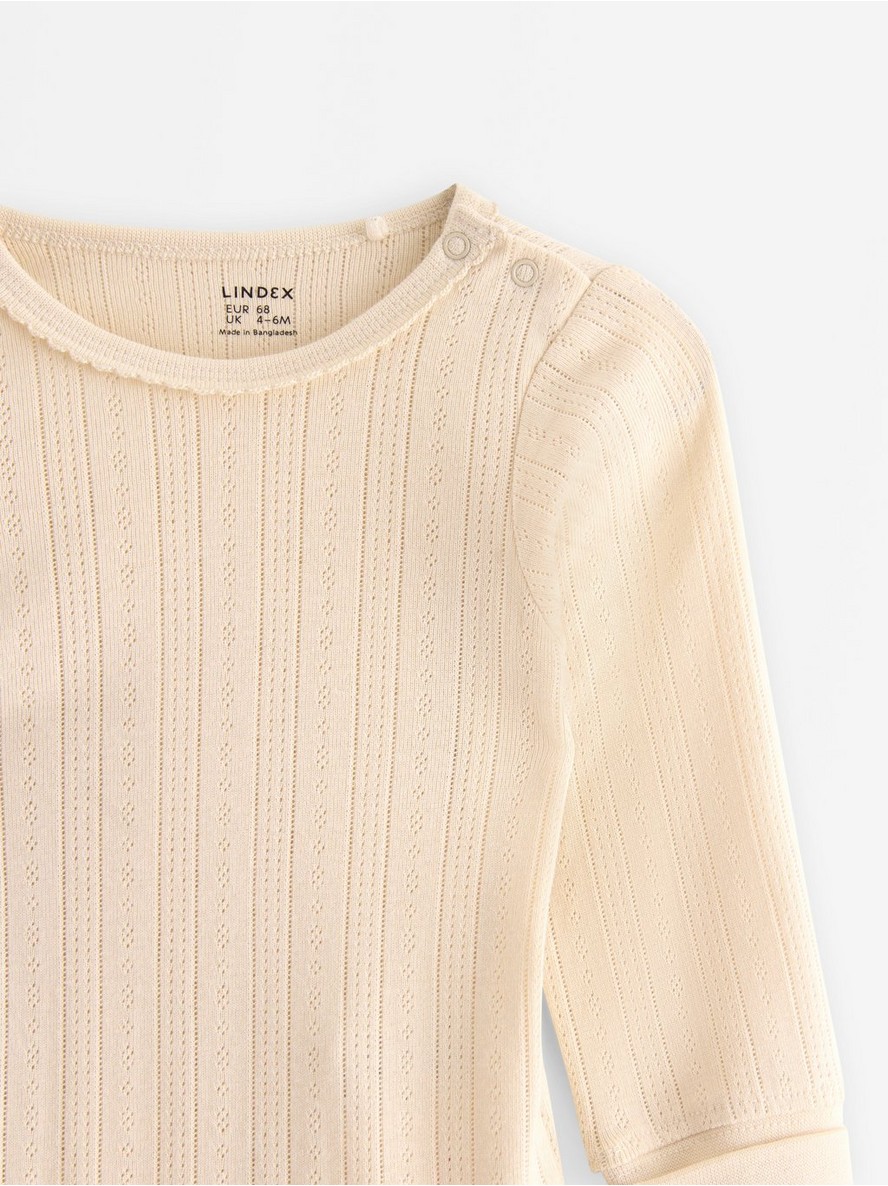 Meki bodić sa dugim rukavima od pointelle pletenine. Zahvaljujući našem pametnom rešenju Extended size, beba može porasti za jednu veličinu, a i dalje nositi isti komad odeće.