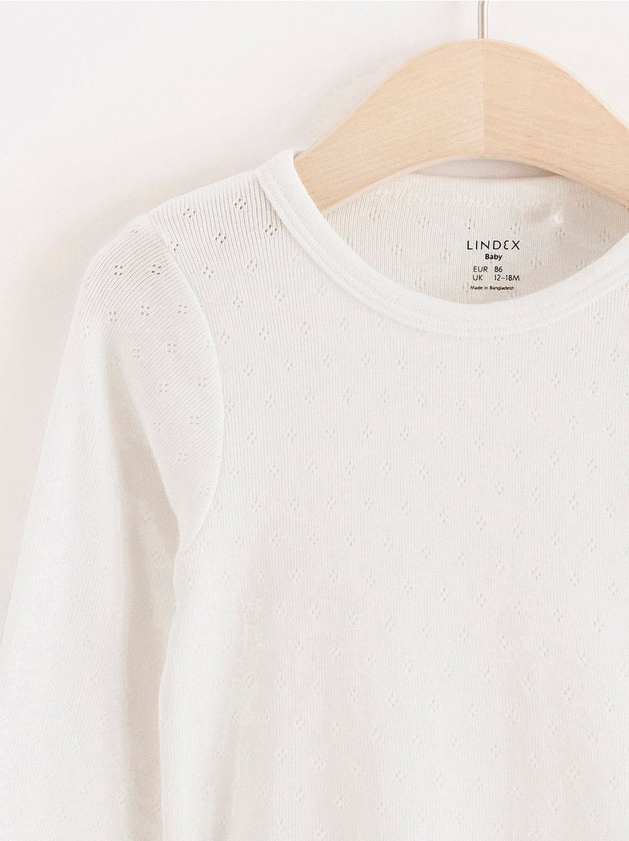 Bodi od mekog pointelle pletiva sa dugim rukavima. Sa našim rešenjem „Extended size“, uz duge preklopne manžetne na rukavima i dvostruki red drukera u preponama, beba može da poraste za jednu veličinu, a da i dalje nosi isti komad odeće. ODRŽIVOST. Ovaj komad ima GOTS sertifikat. Napravljen je od organskog pamuka i svaki korak u proizvodnji je nezavisno sertifikovan kako bi se osiguralo da ispunjava društvene i ekološke zahteve GOTS-a (Globalni standard za organski tekstil).