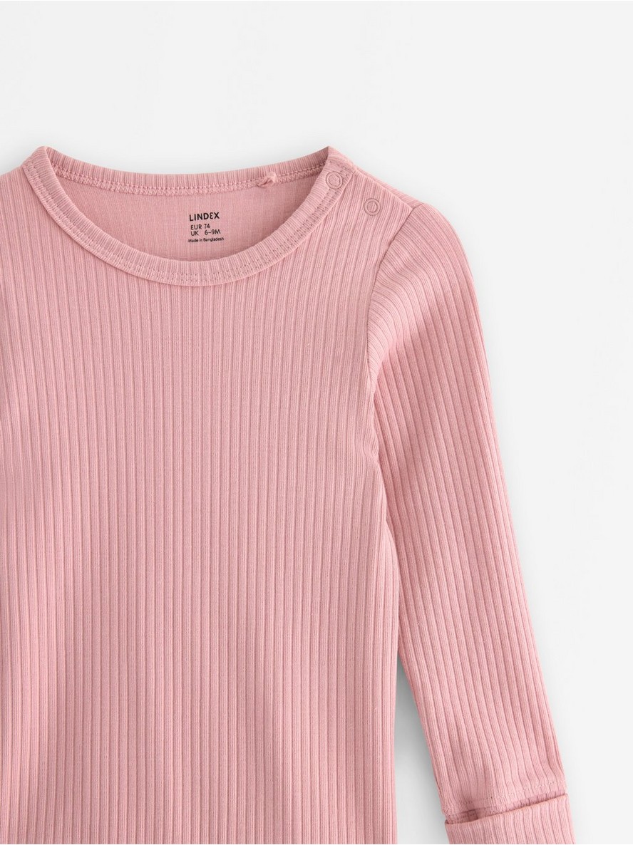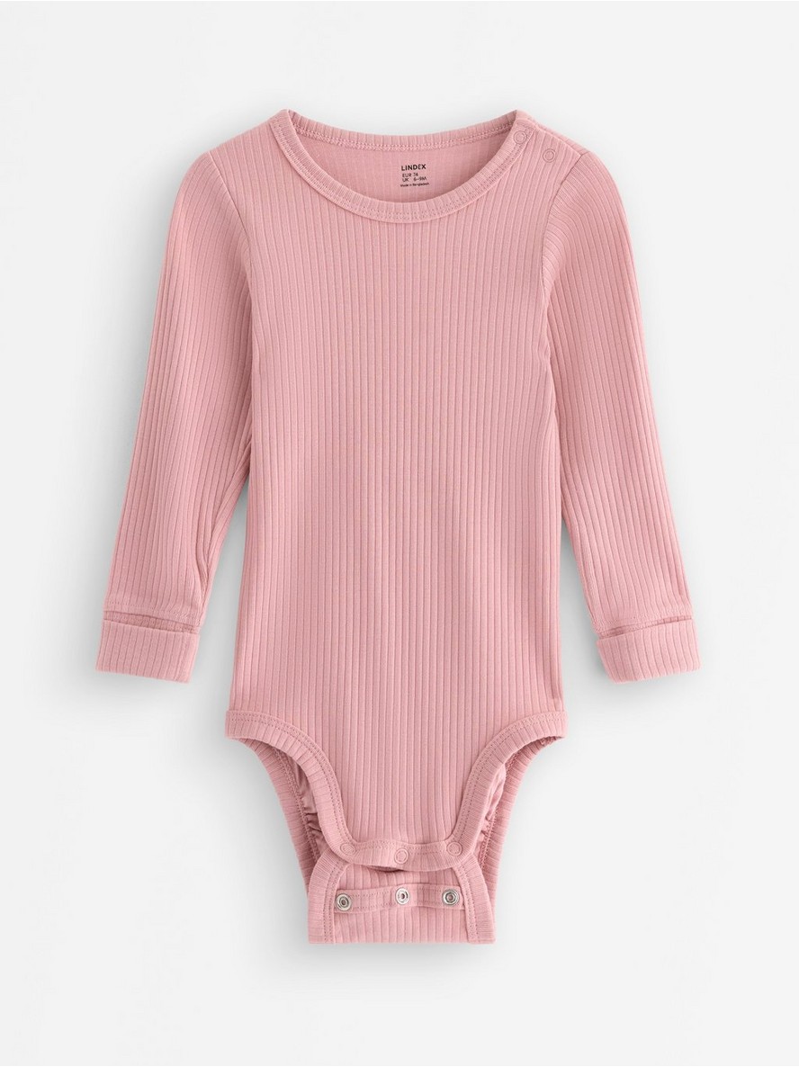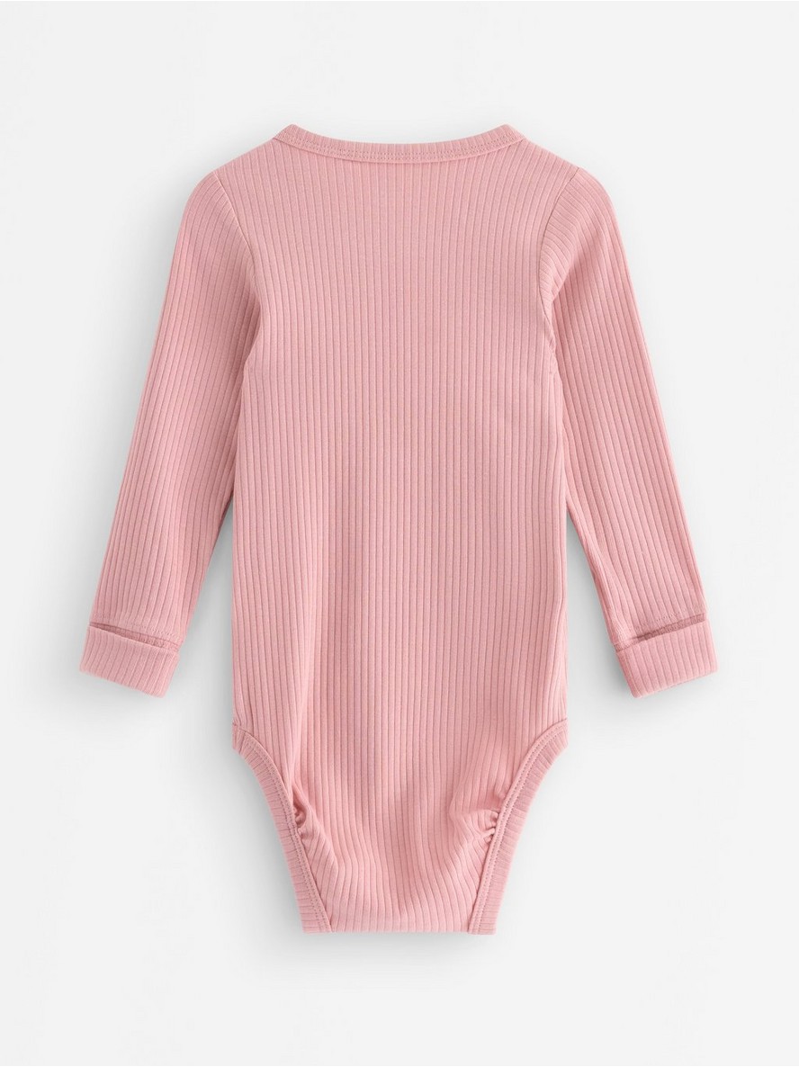 Bodi za bebe sa dugim rukavima od mekanog, rebrastog pamučnog džerseja. Sa našim pametnim rešenjem „Extended size“ beba može porasti za jednu veličinu i i dalje nositi isti komad odeće.