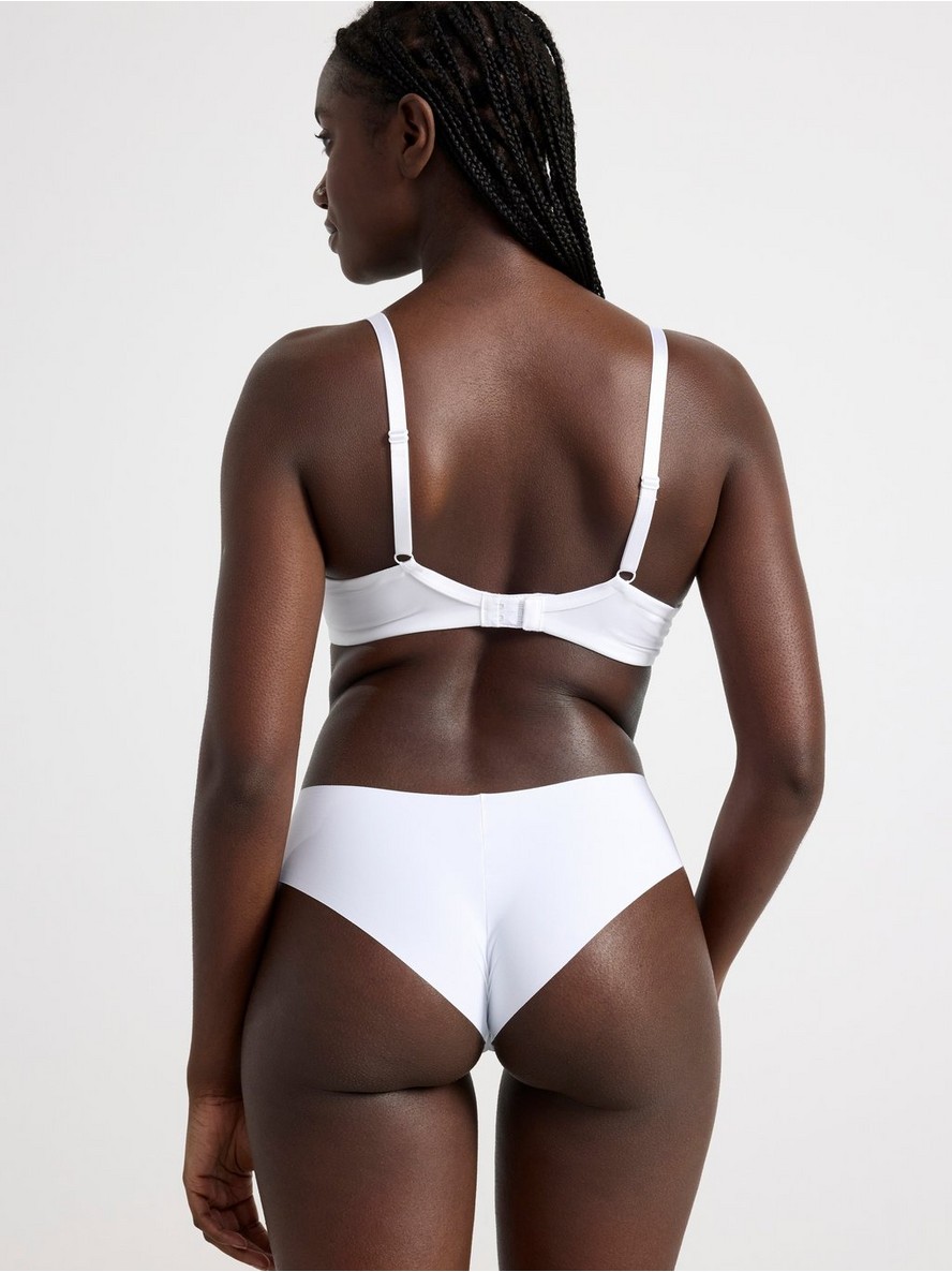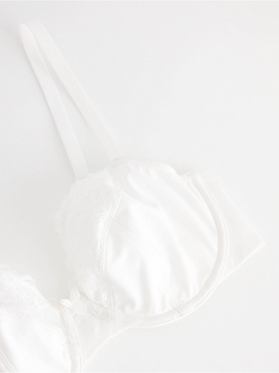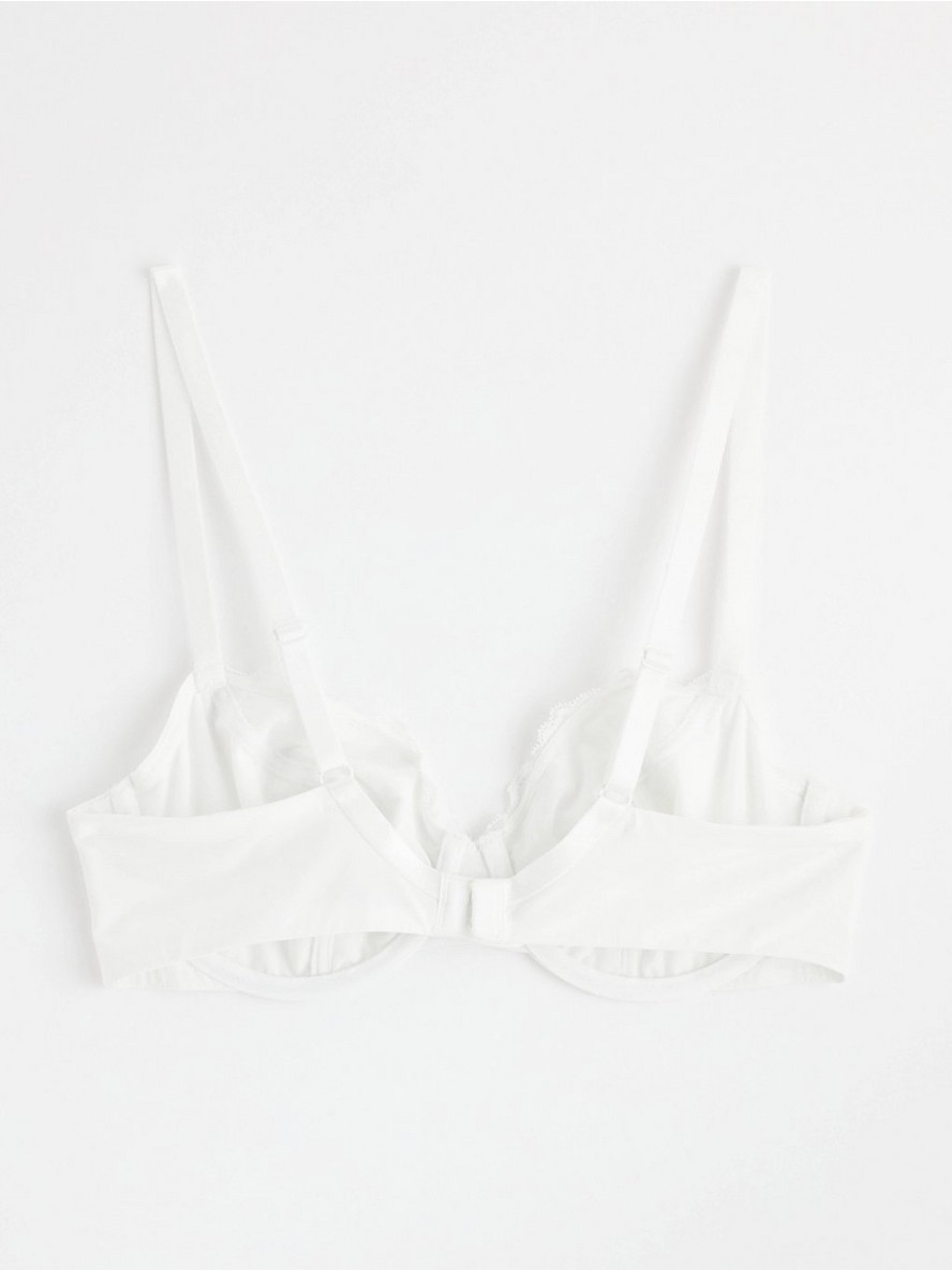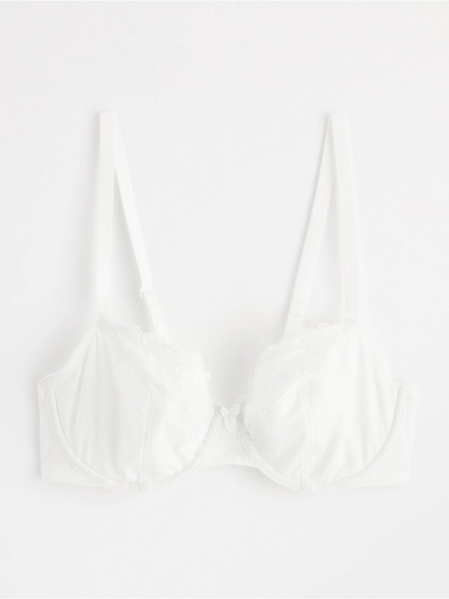 Grudnjak bez punjenja sa žicom i elegantnom čipkom na gornjoj polovini košarica. Tanke naramenice i čvrsta žica pružaju udobnost, podršku i prirodan oblik za punije grudi.