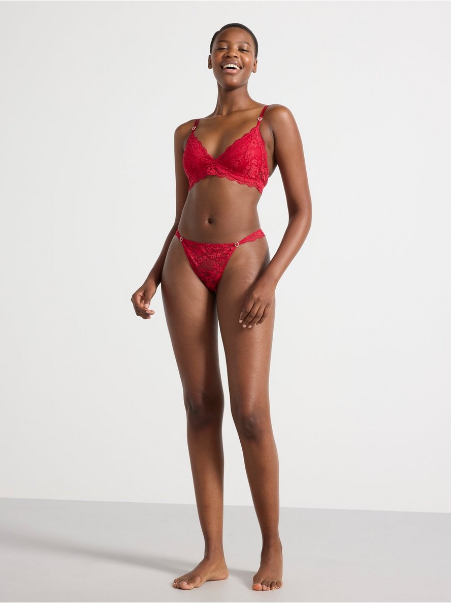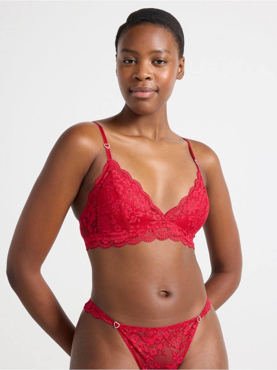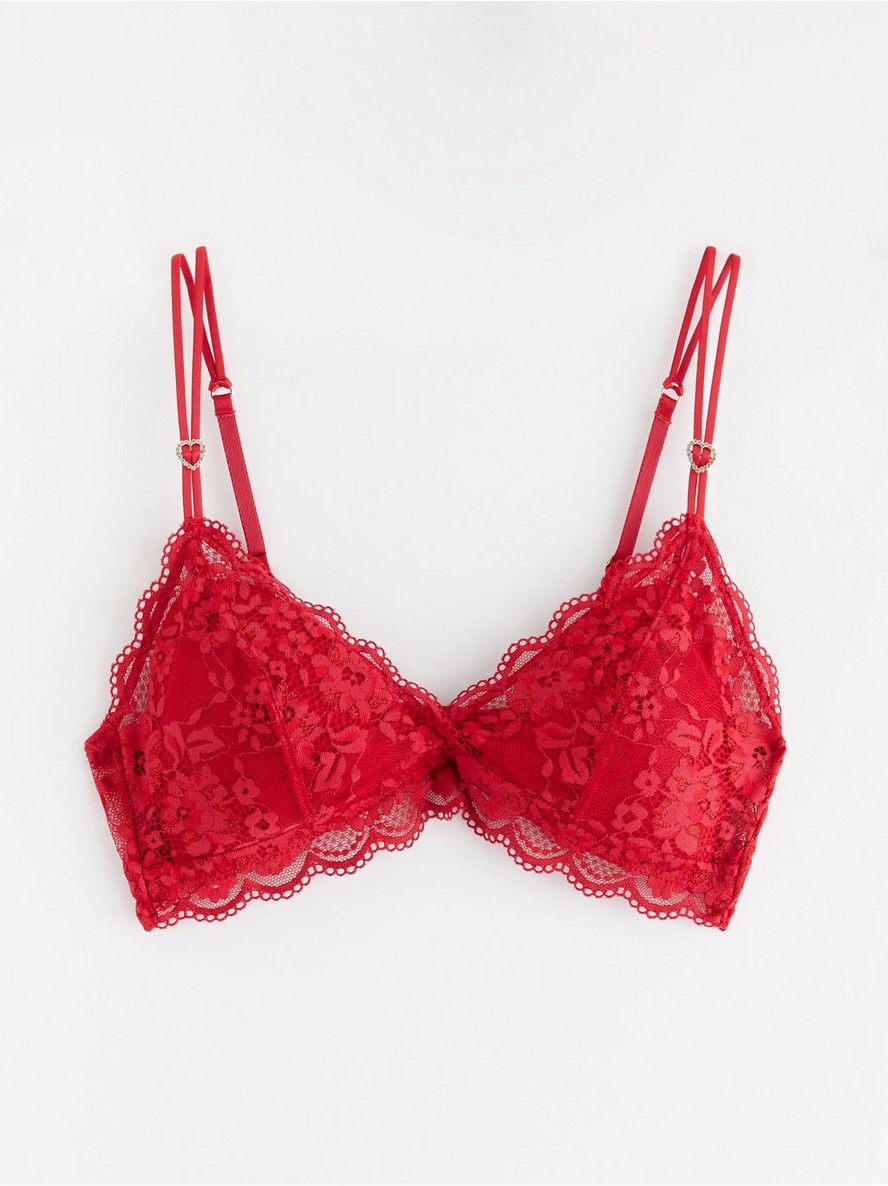Mekano podstavljen bralet od čipke sa tankim naramenicama ukrašenim srcima od cirkona.