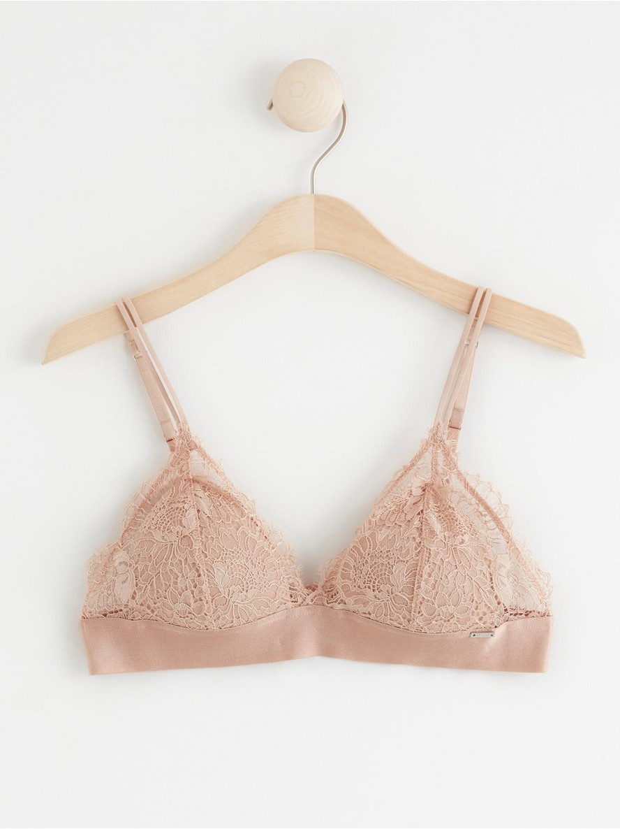Bralette od čipke bez žica sa tankim naramenicama, tankim uložcima i lepim čipkanim ivicama sa trepavicama. Uparite ga sa par odgovarajućih gaćica za kompletan set.