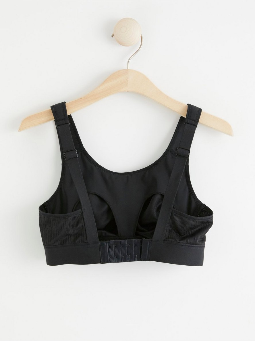 Sportski grudnjak sa srednjom podrškom, sa spuštajućim korpicama i prednjim kopčanjem koje omogućava lako i praktično dojenje.