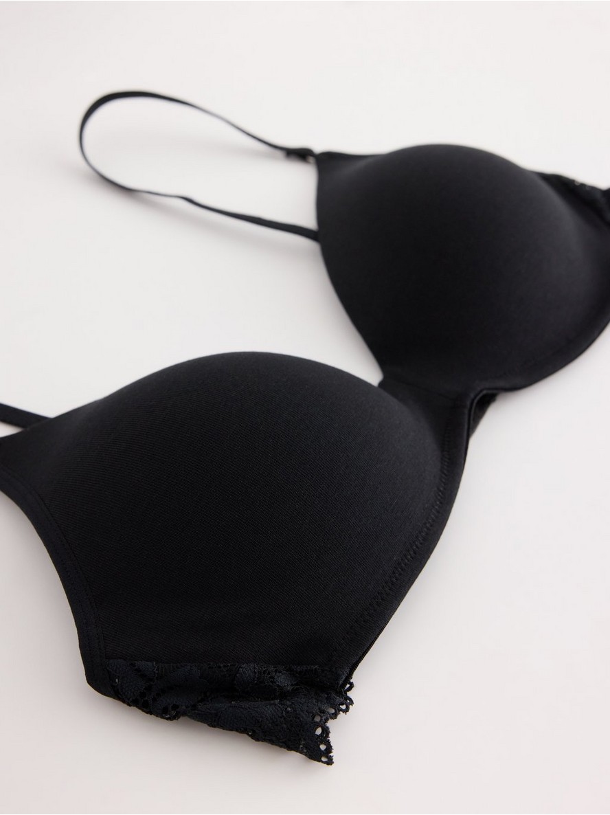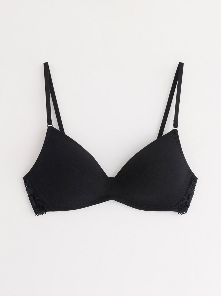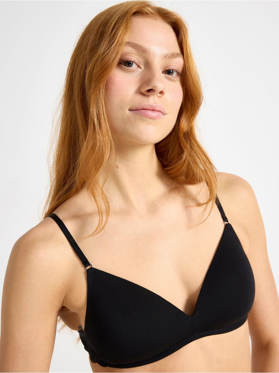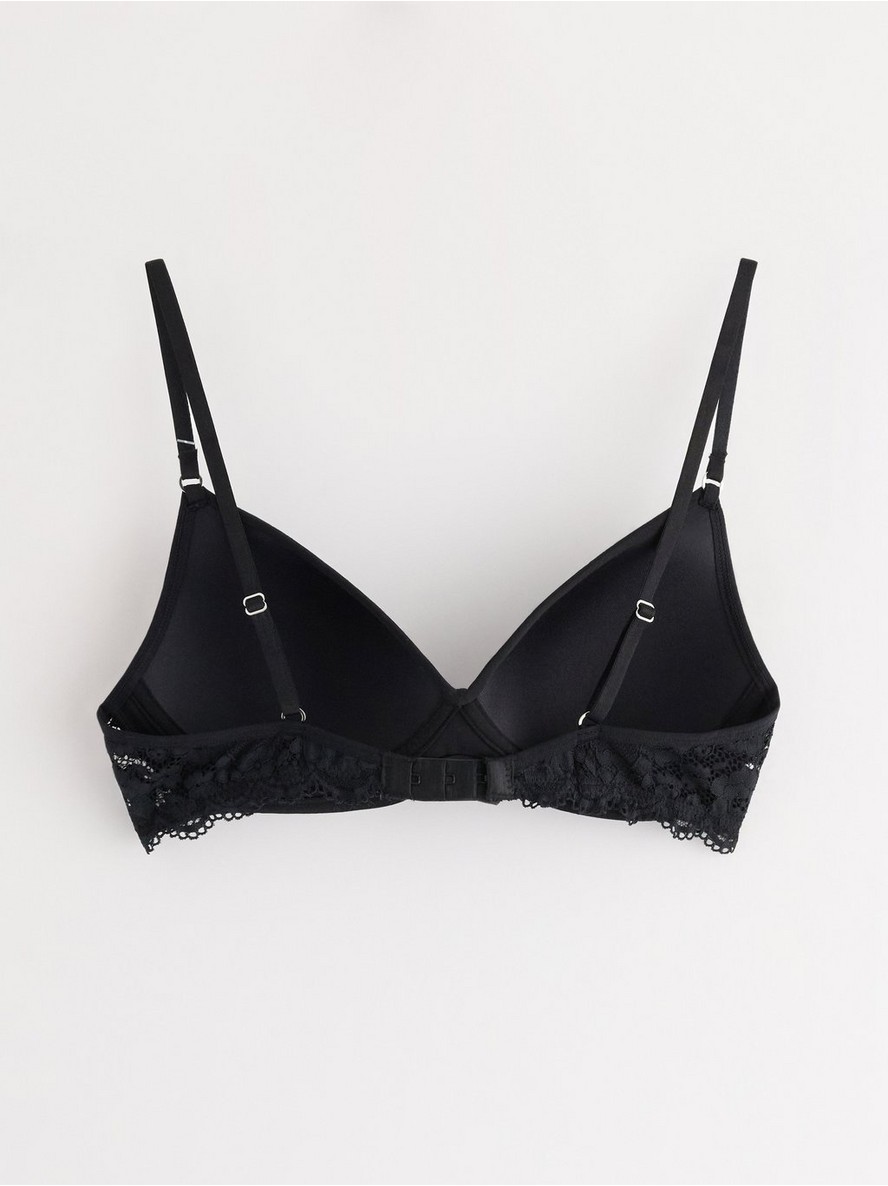 Blago podstavljeni grudnjak sa lagano oblikovanim košaricama, tankim podesivim bretelama i čipkom pozadi.