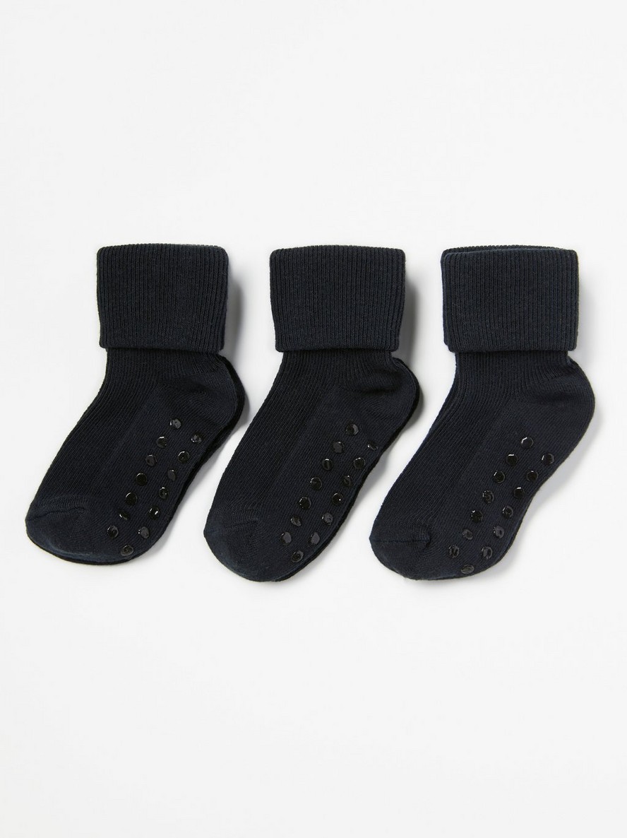 Tri crne čarape, izrađene od mešavine organskog pamuka, sa dugim preklopivim rebrastim manžetnama. Veličina 19/21 ima protivklizni sloj.
