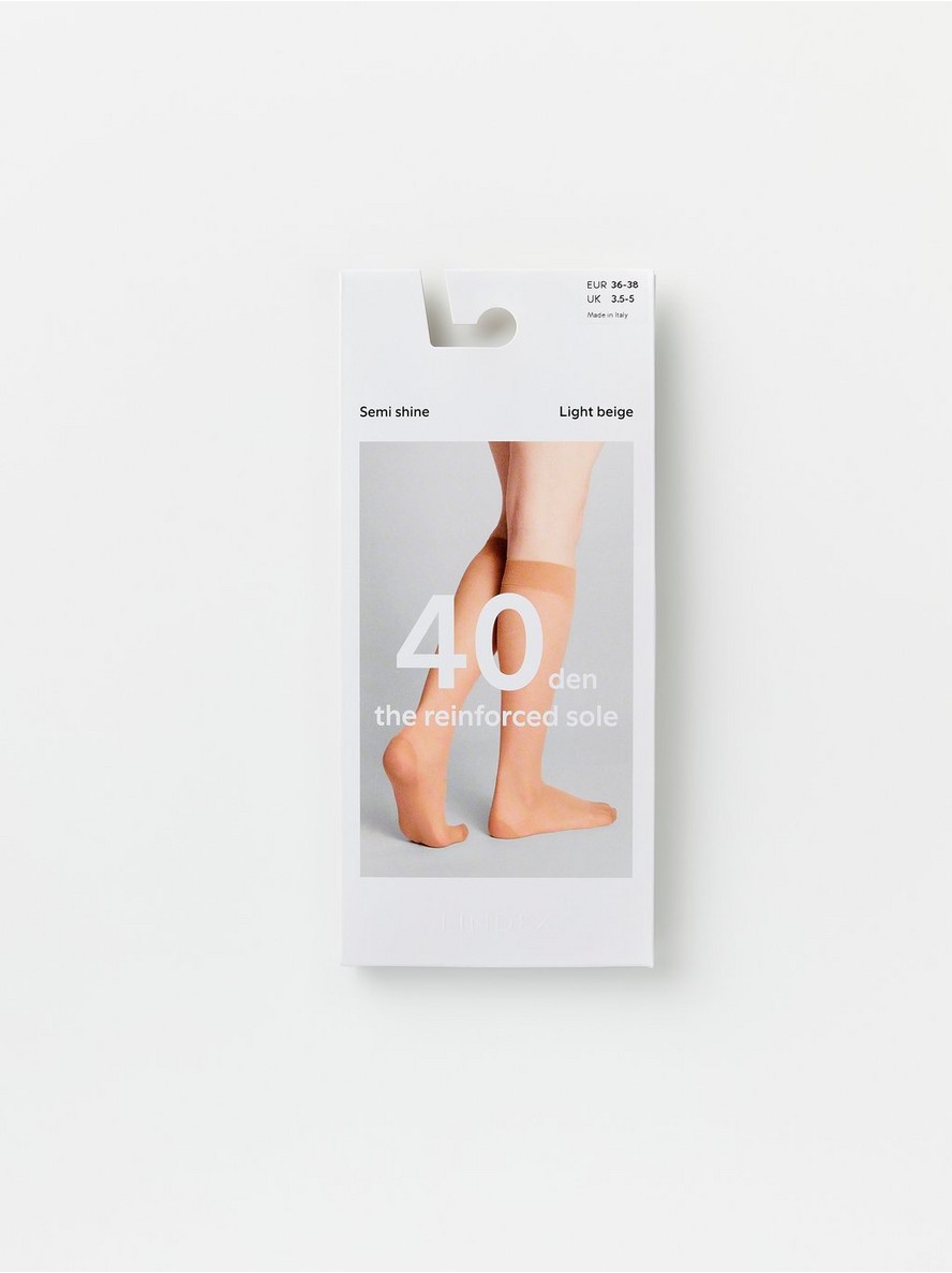Par polusjajnih čarapa do kolena, 40 den, sa udobnom elastičnom trakom i ojačanim stopalom.
