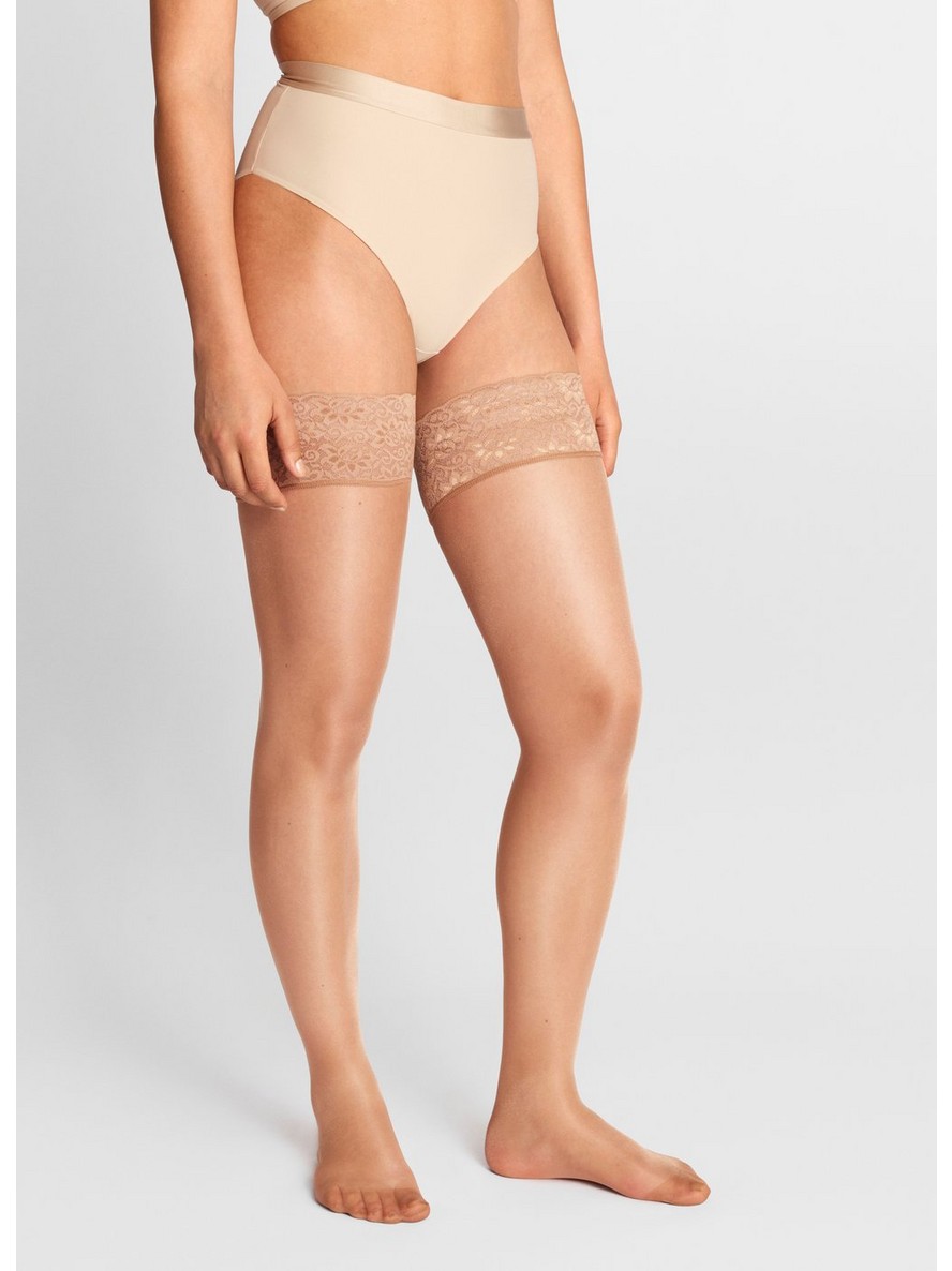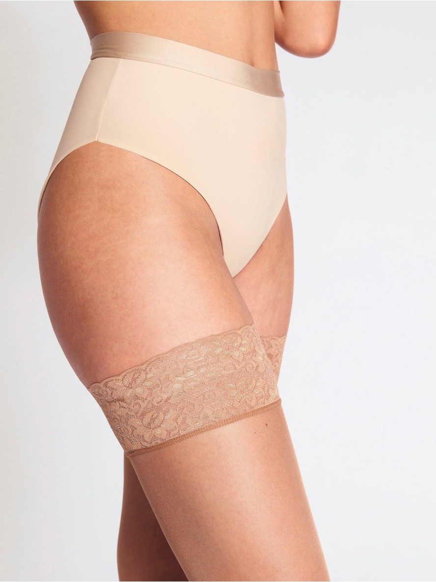 Samodržeće čarape sa sjajnim finišem i silikonskom trakom iznutra koja ih drži na mestu.