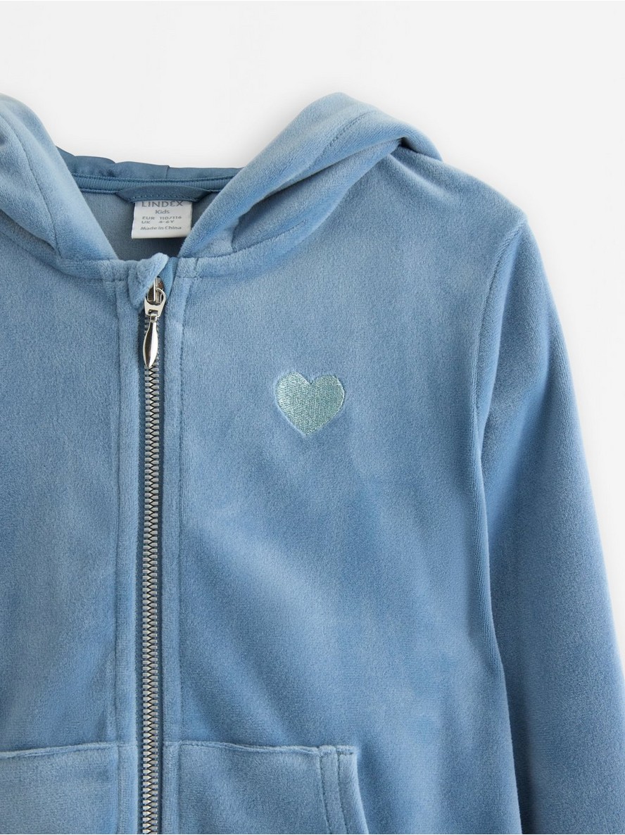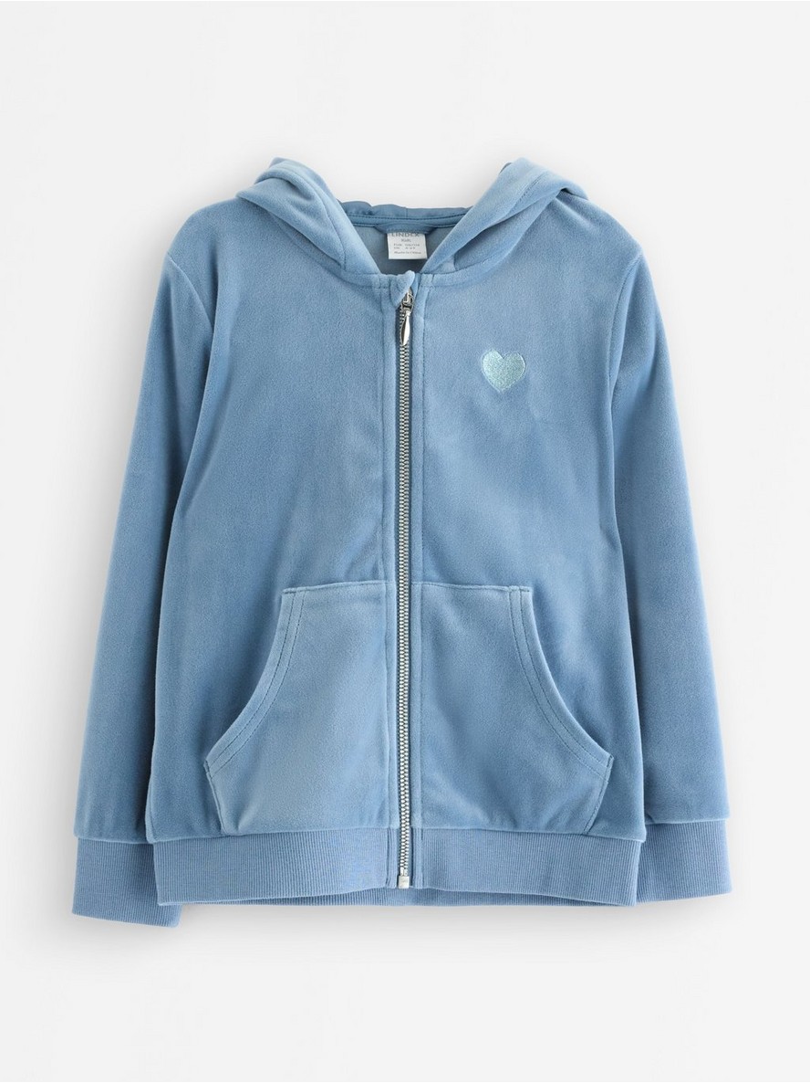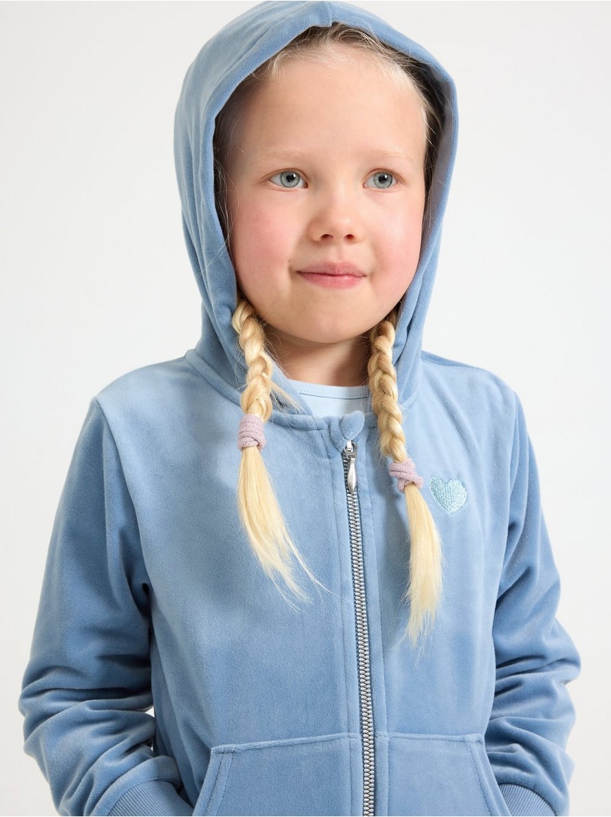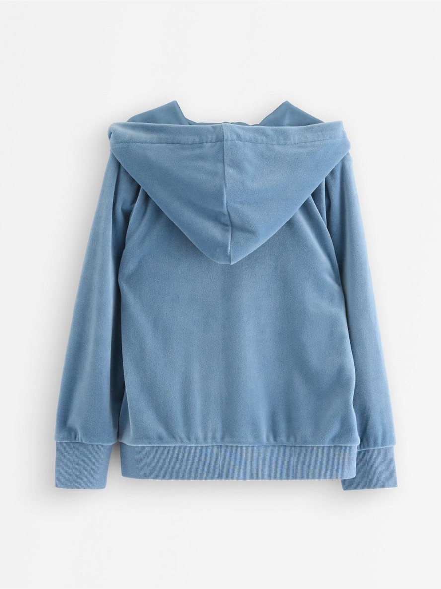 Mekana velurna dukserica sa opuštenim krojem, rajsferšlusom i prednjim džepovima.