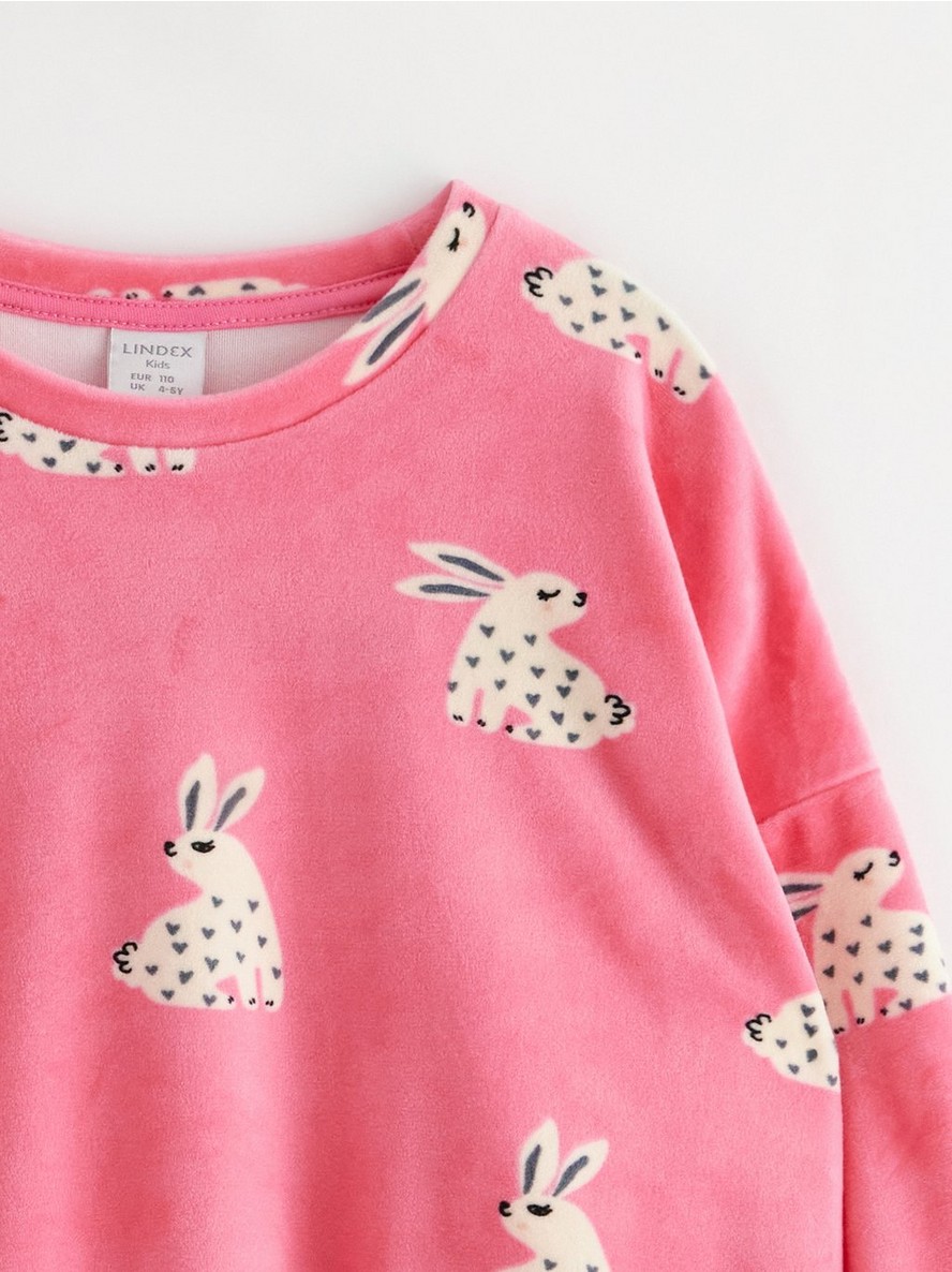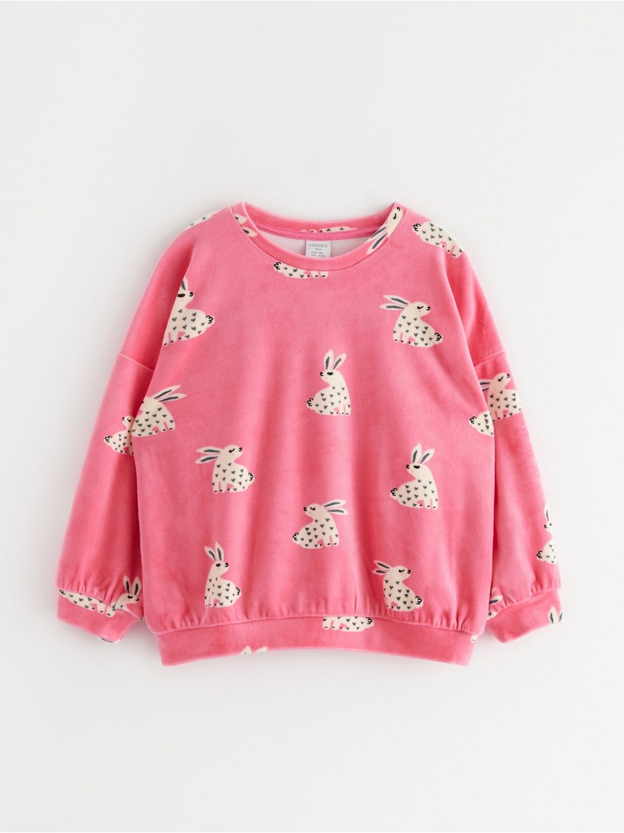 Džemper dugih rukava od mekanog velura sa dezenom po celoj površini i okruglim izrezom.