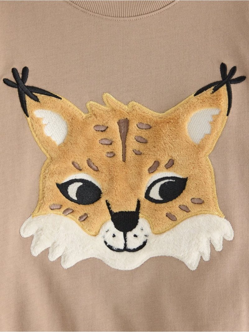 Mekana pamučna dukserica opuštenog kroja, sa brušenom unutrašnjošću i aplikacijom na prednjem delu.