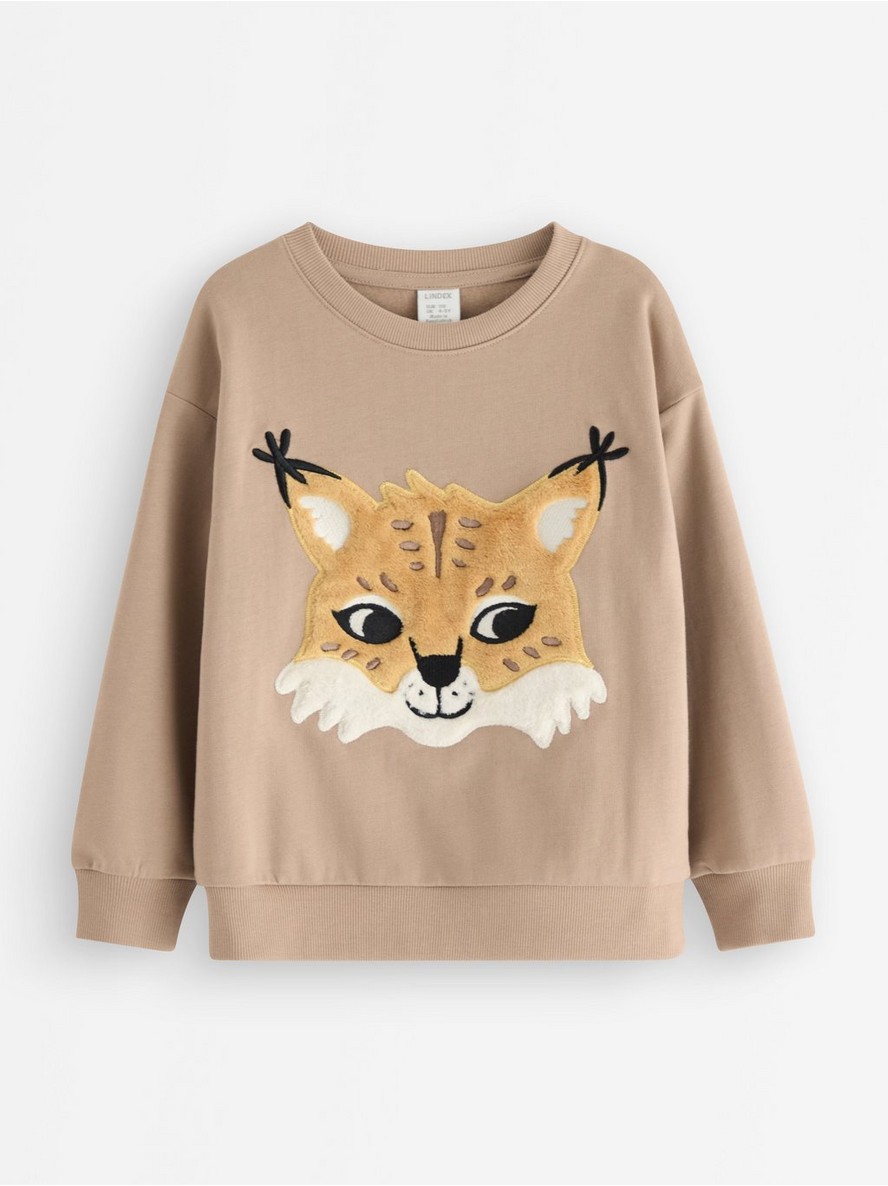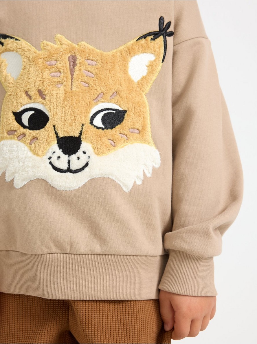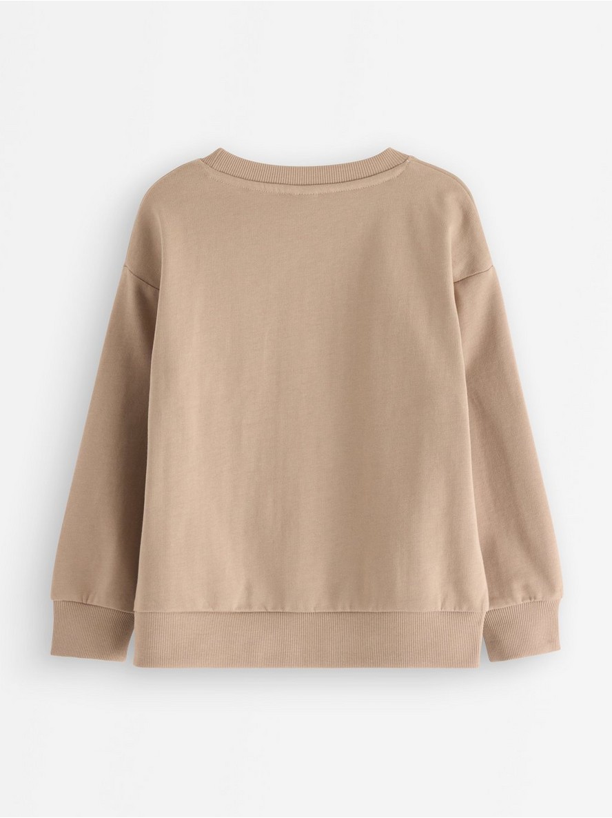 Mekana pamučna dukserica opuštenog kroja, sa brušenom unutrašnjošću i aplikacijom na prednjem delu.