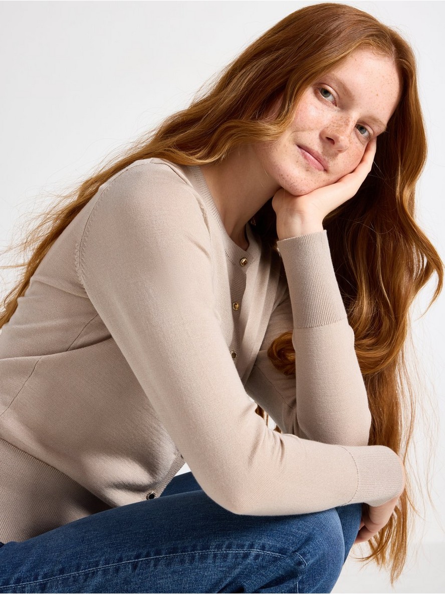 Elegantan kardigan od finog pletiva sa dugim rukavima i ravnim krojem. Kardigan ima zlatne dugmiće duž prednjeg dela.