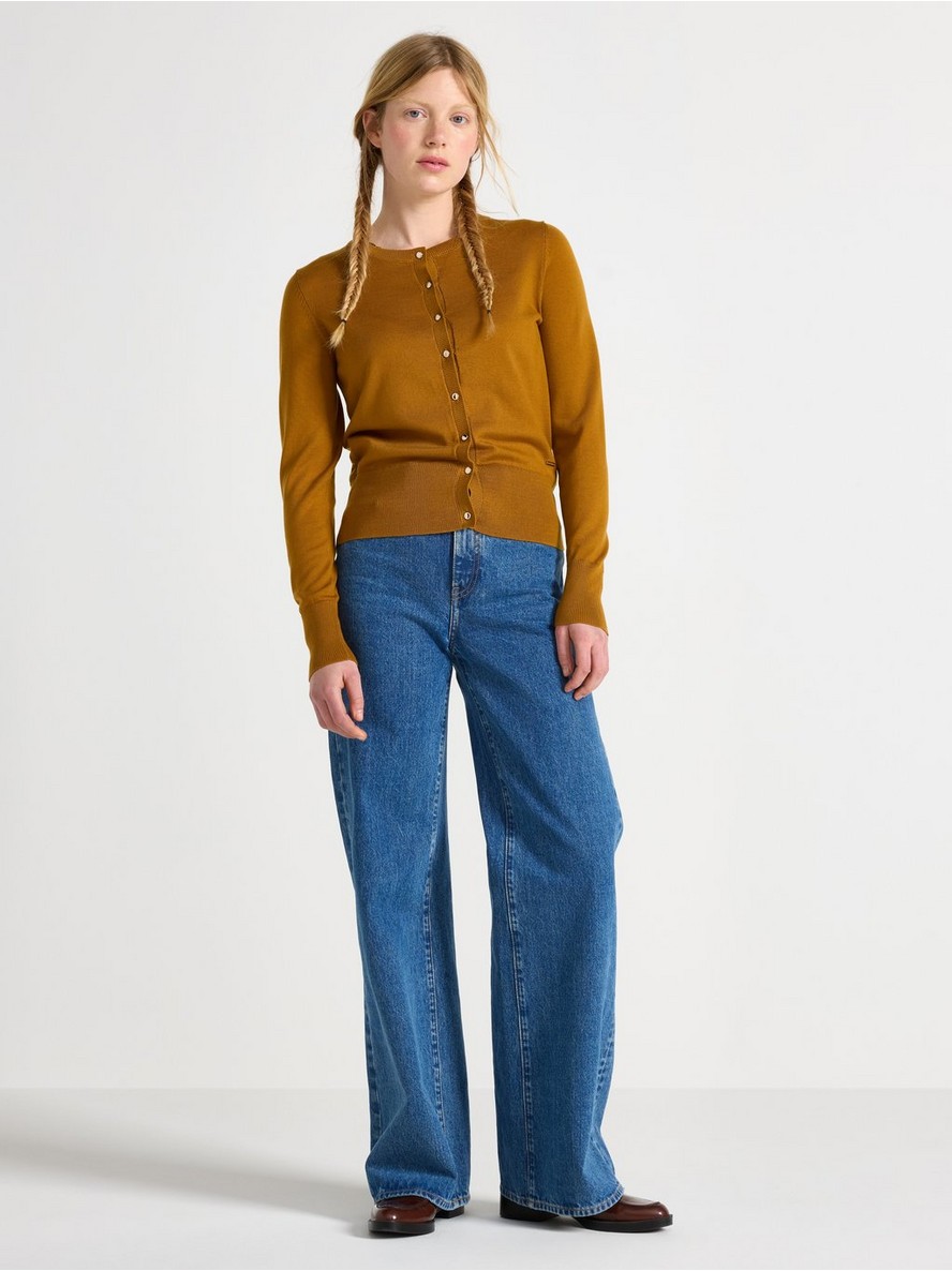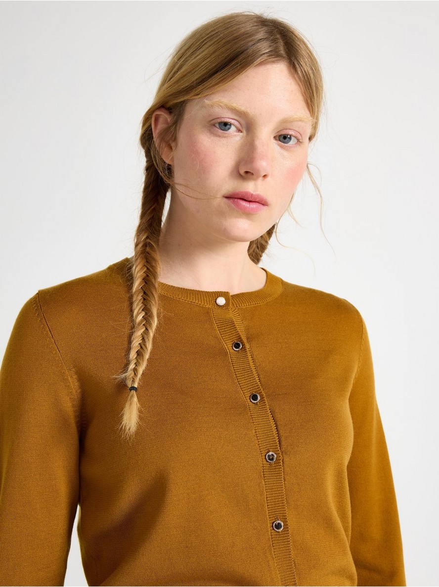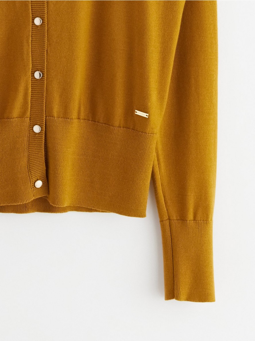Fino pleten kardigan sa dugim rukavima i ravnim krojem. Kardigan ima zlatna dugmad na prednjoj strani.