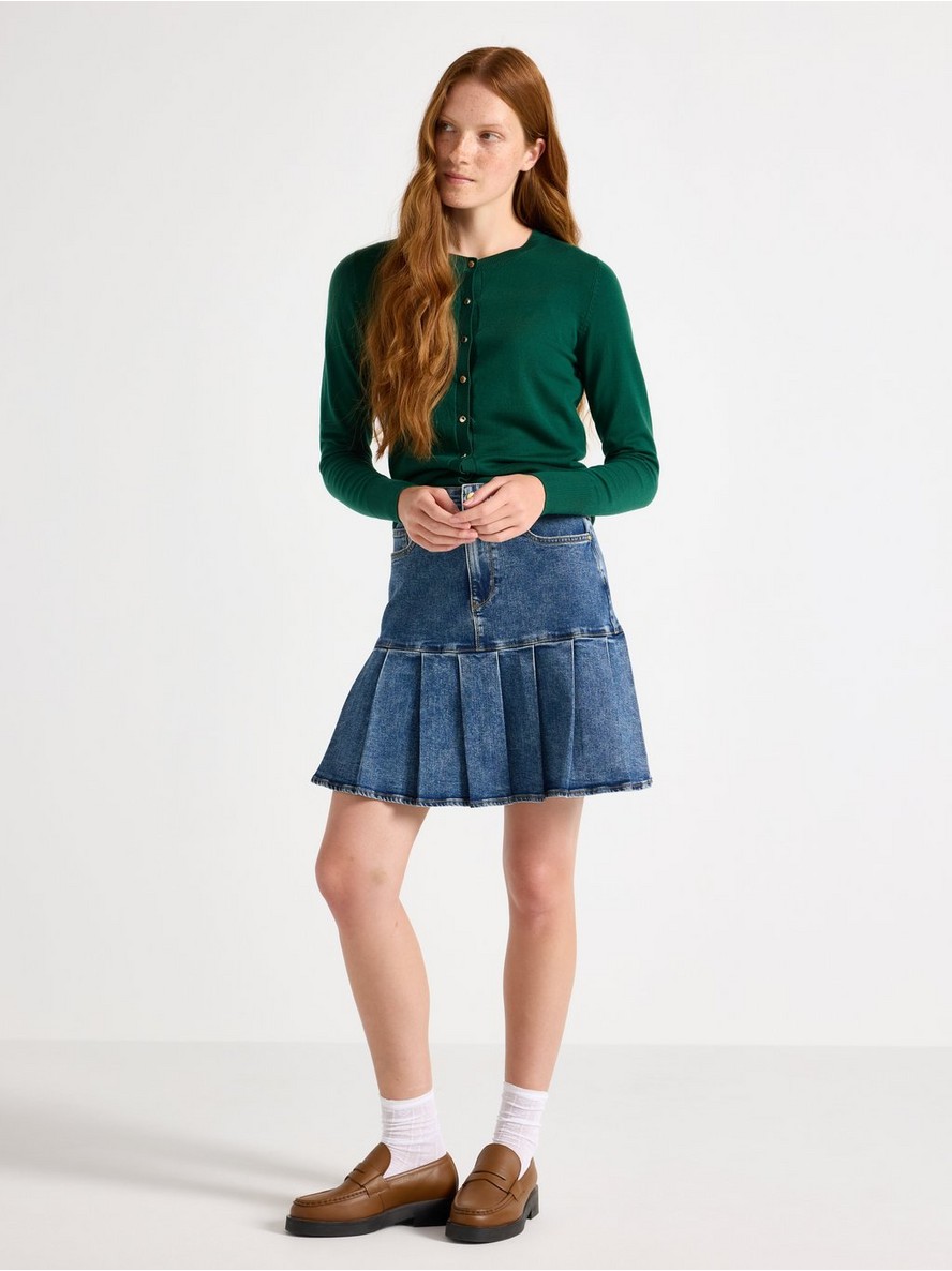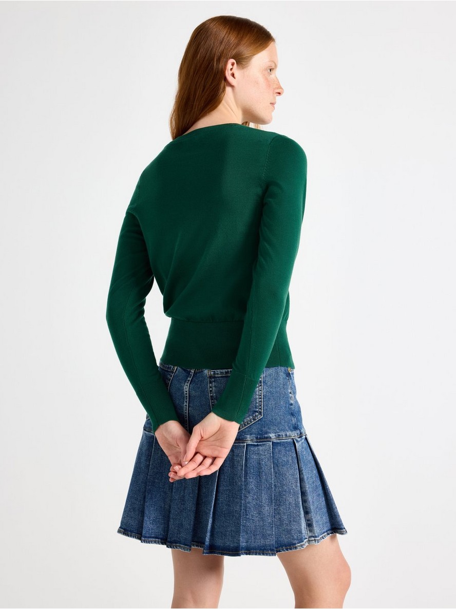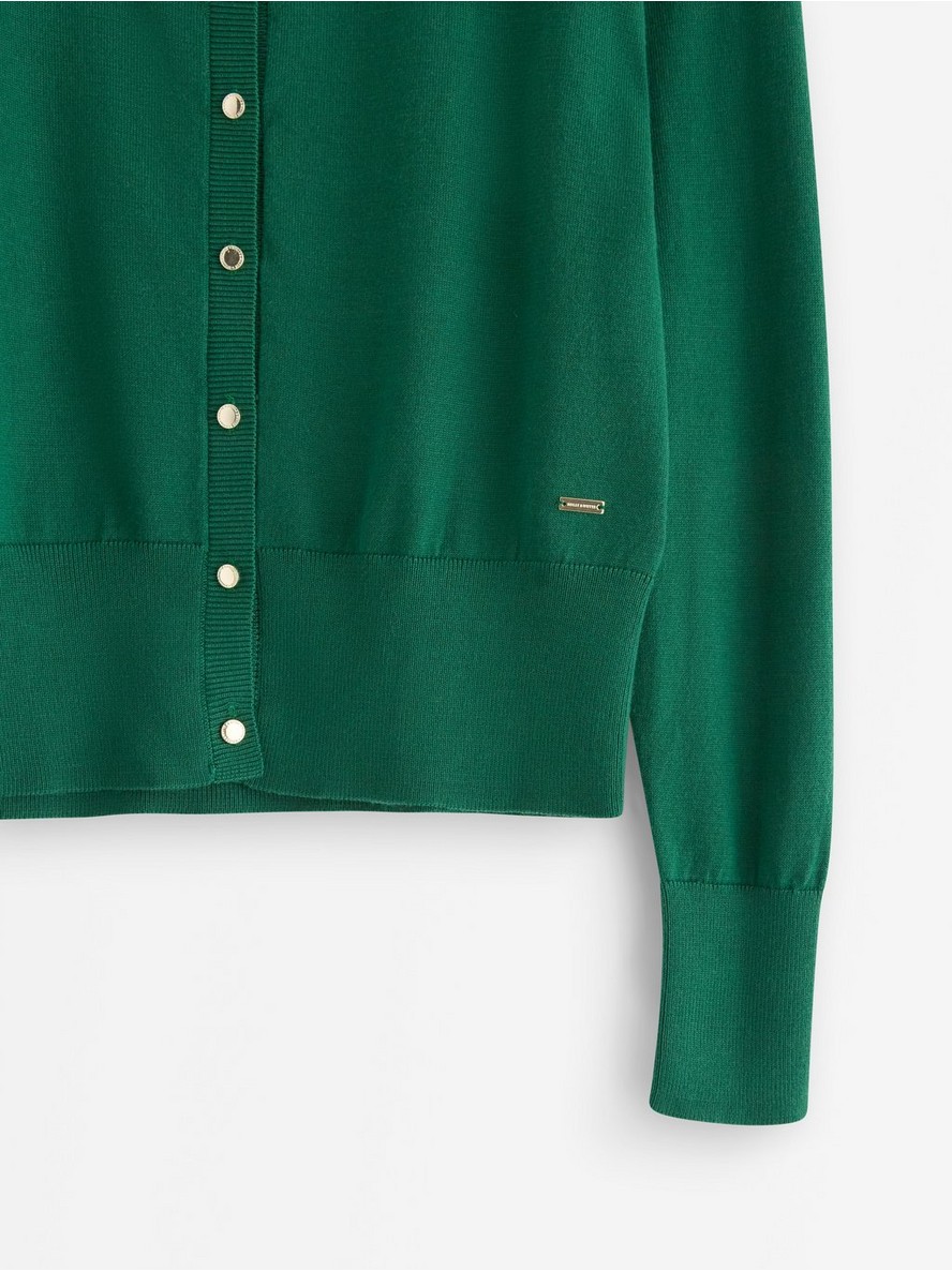 Fino pleteni kardigan sa dugim rukavima i ravnim krojem. Kardigan ima dugmad zlatne boje na prednjem delu.