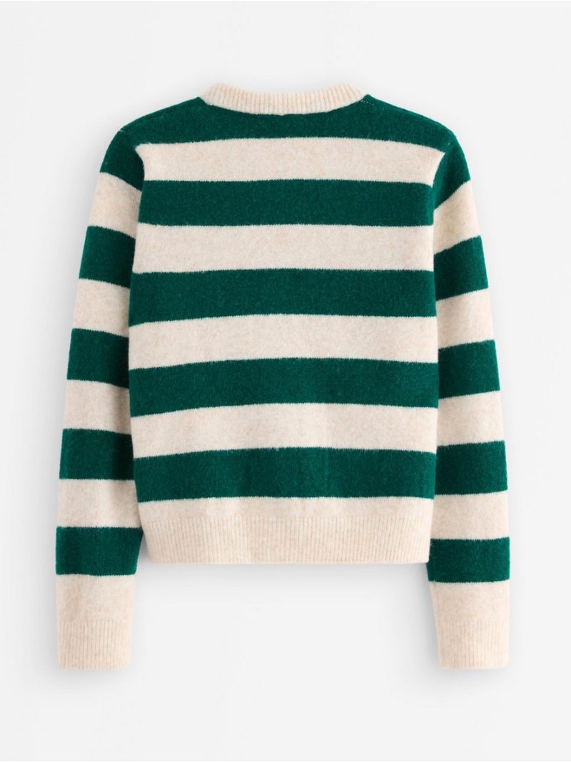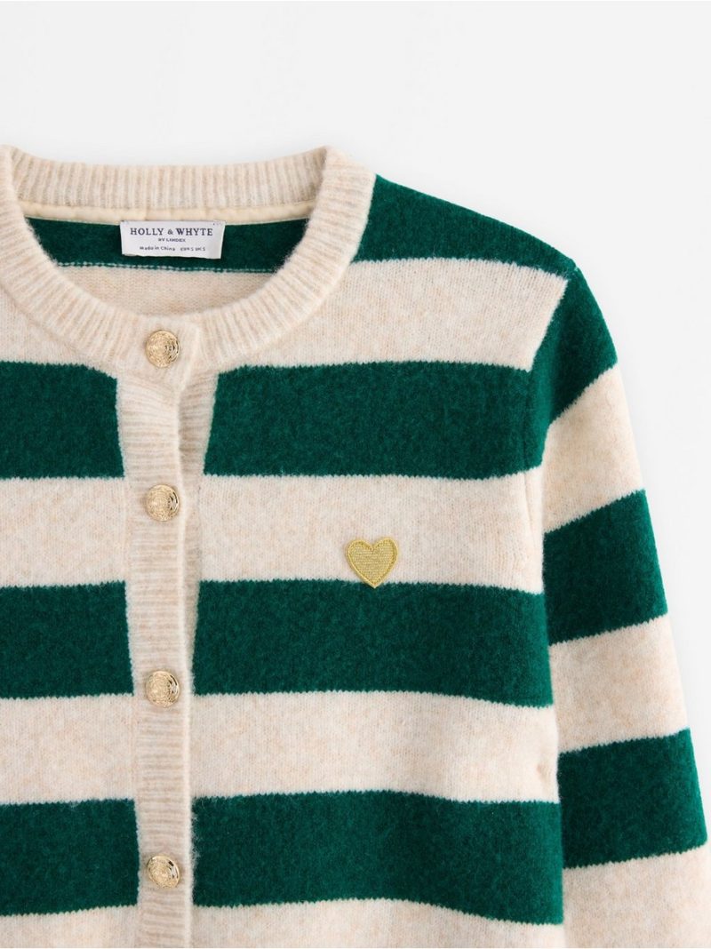 Pleteni kardigan sa dugmadima u zlatnoj boji.