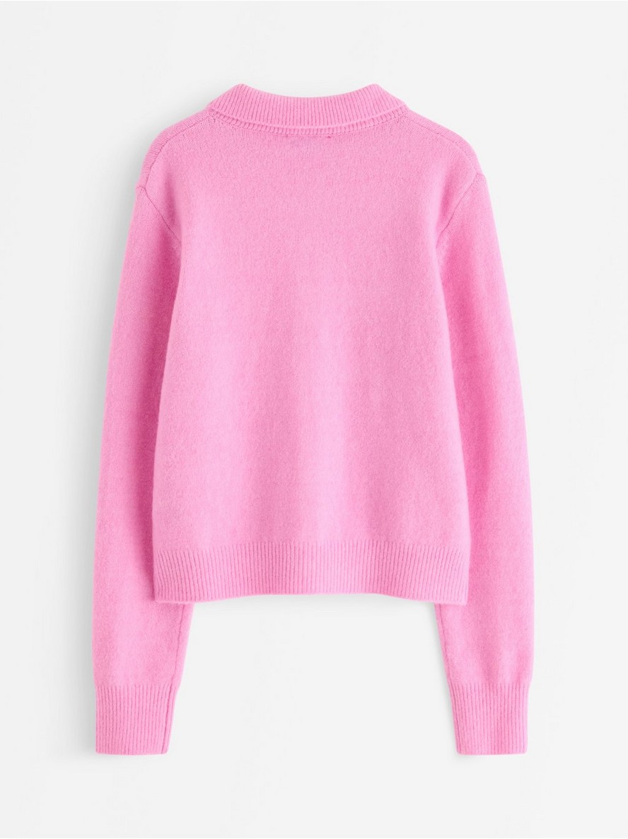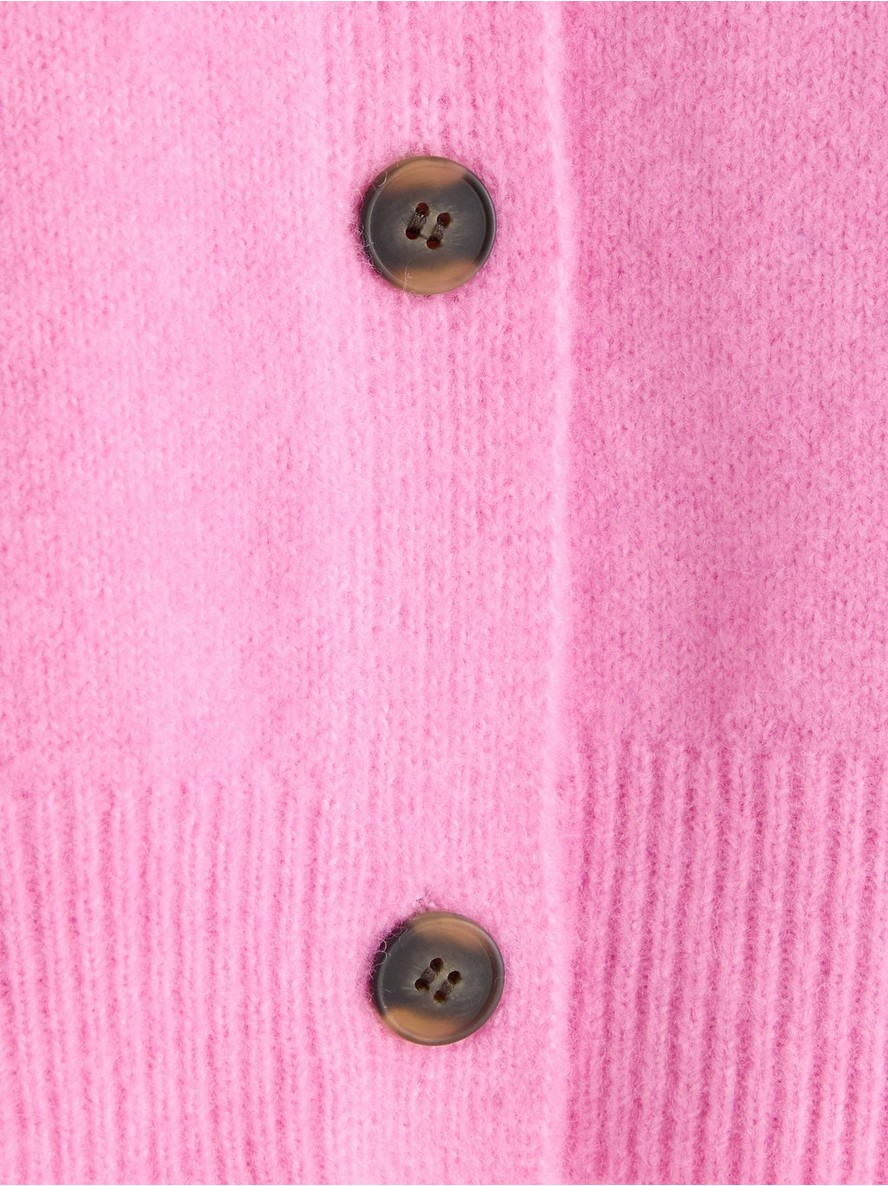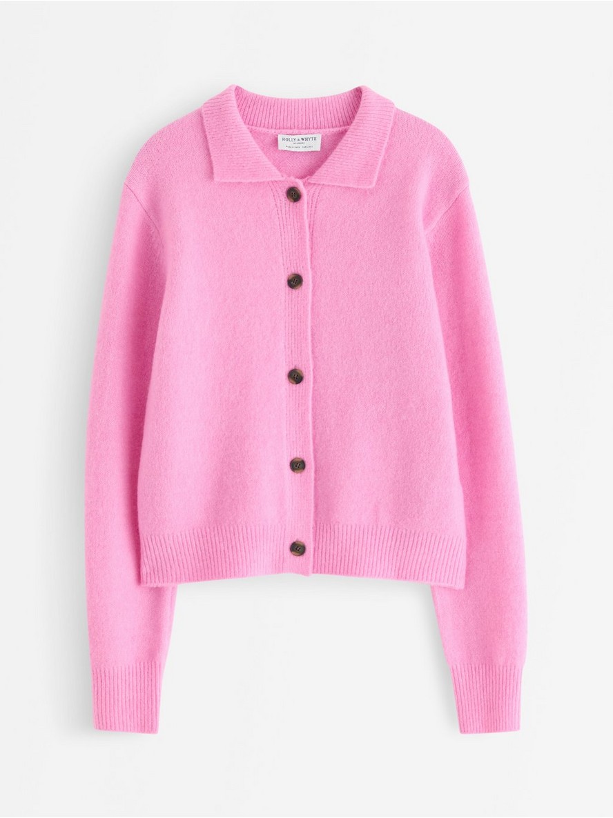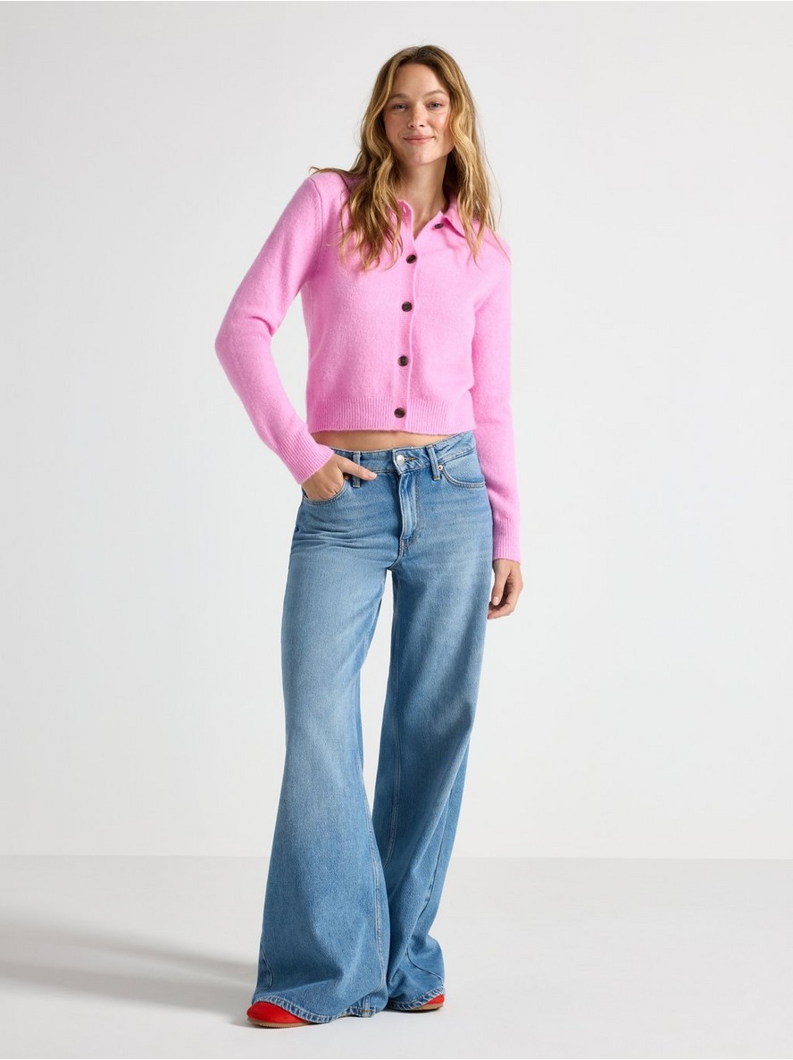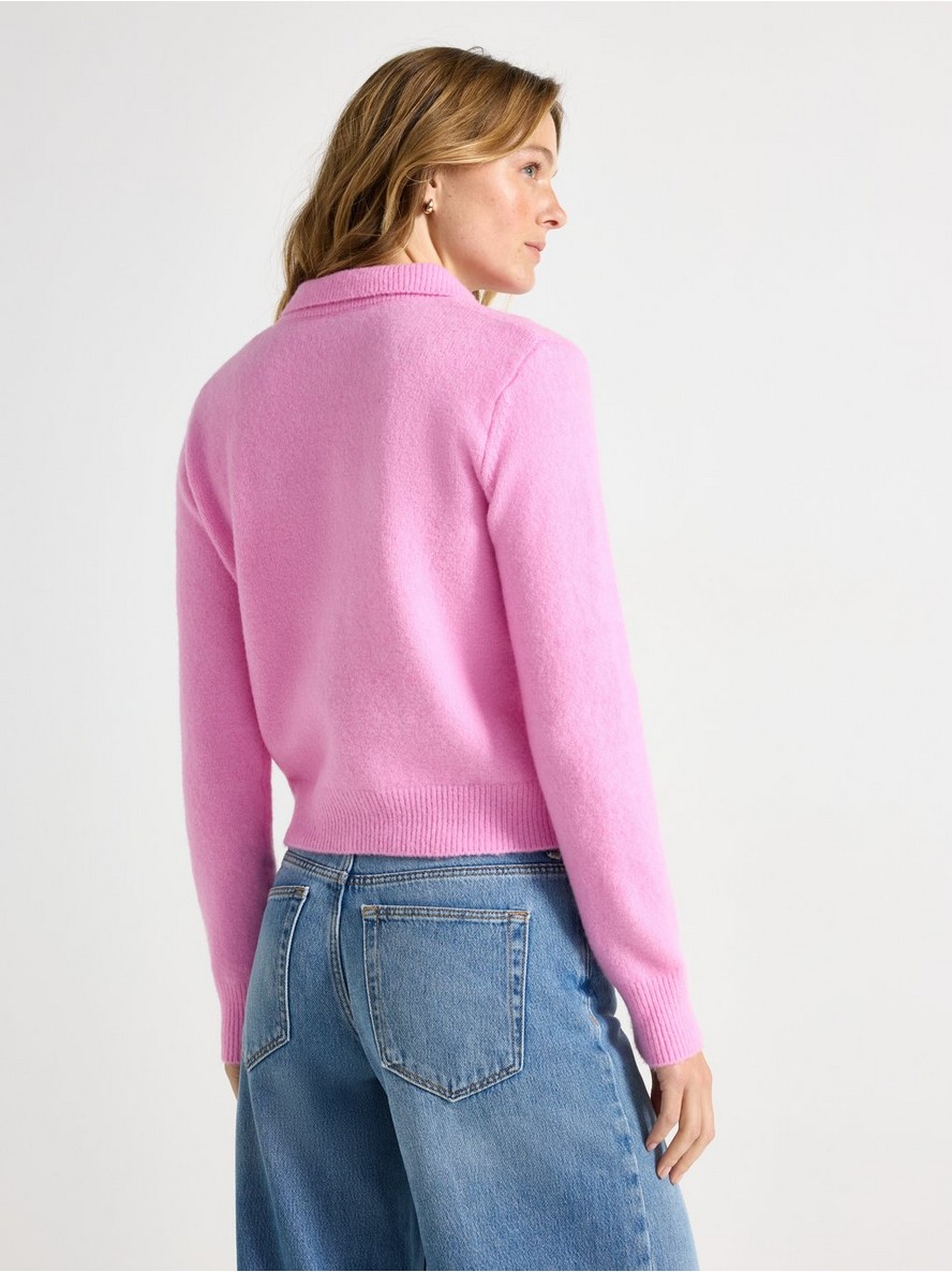 Mekan pleteni kardigan sa kragnom i dugmadima na prednjoj strani.