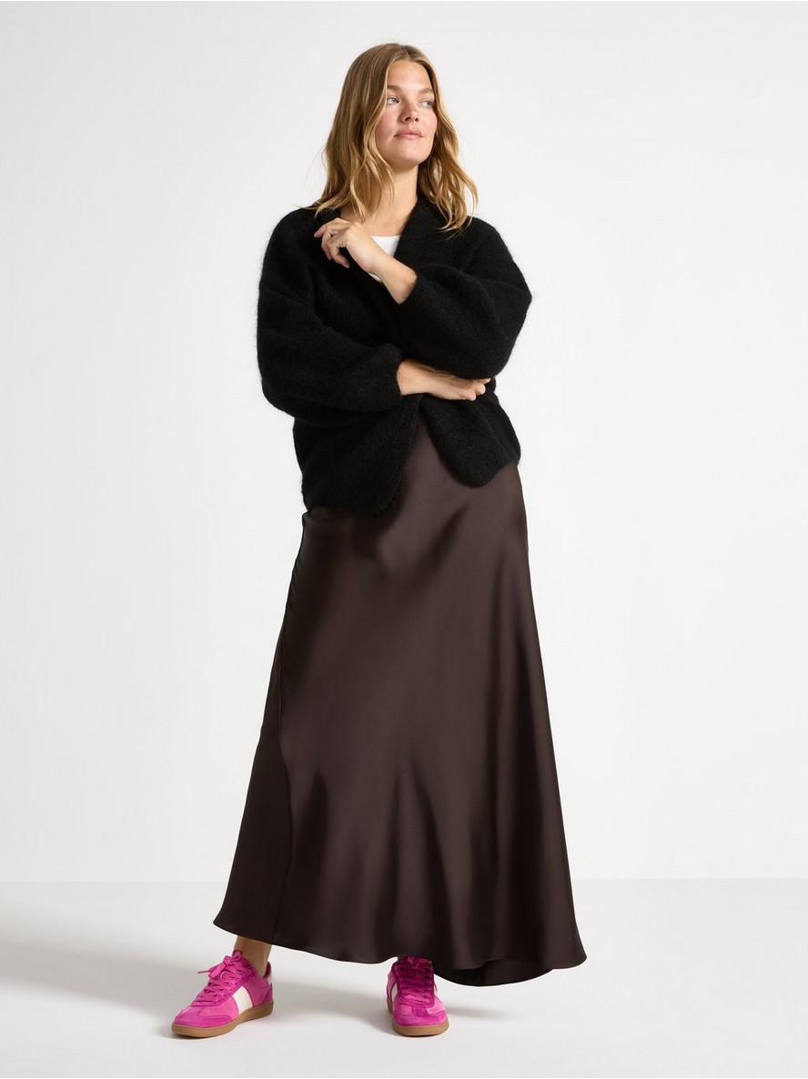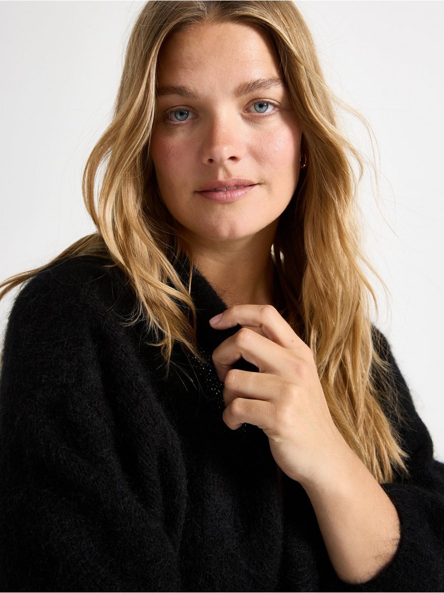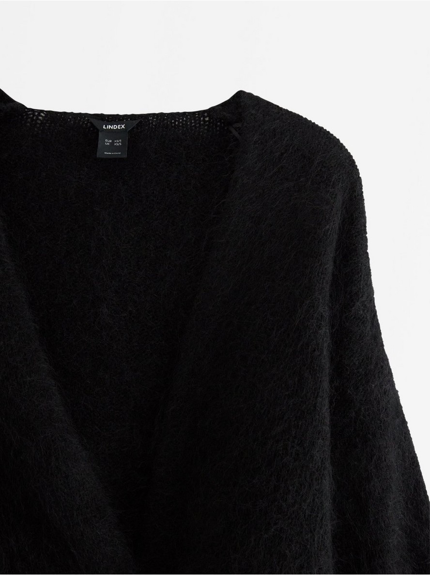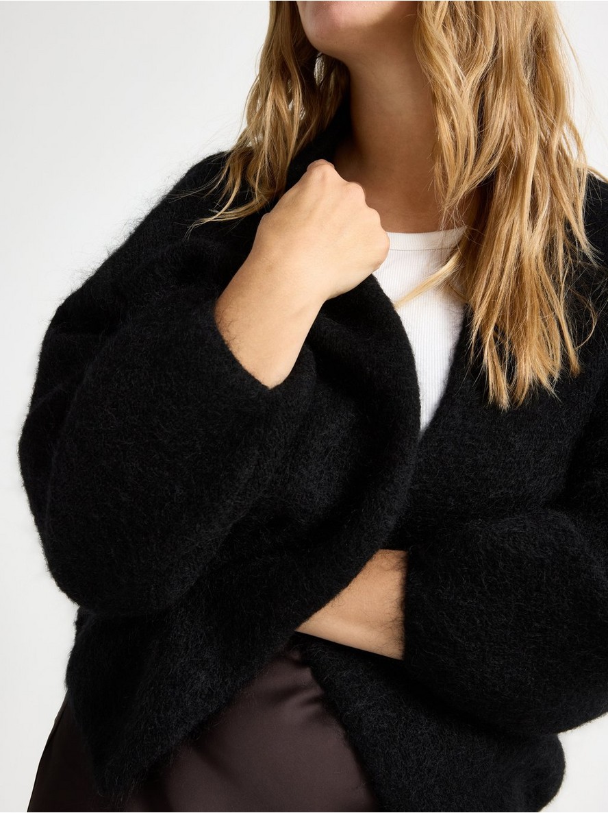 Topao i udoban kardigan od mekane moherove mešavine, sa otvorenim prednjim delom.