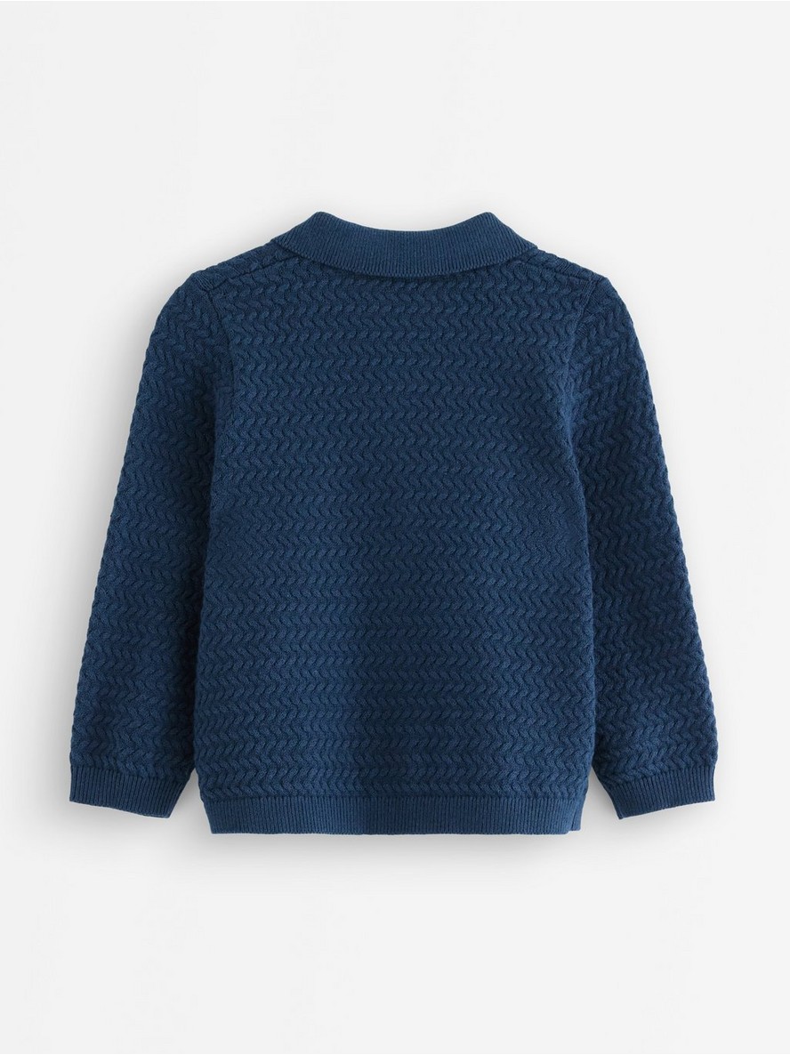 Pleteni kardigan sa kopčanjem na dugmad i kragnom.