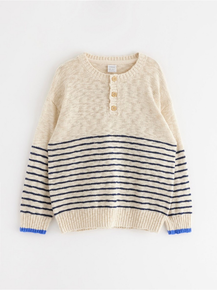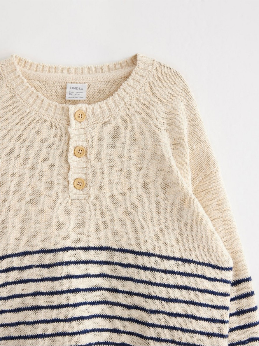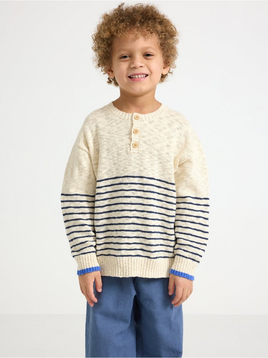 Pleteni džemper od mekanog pamuka sa okruglim izrezom i preklopom sa dugmadima.