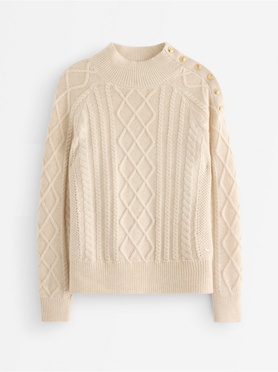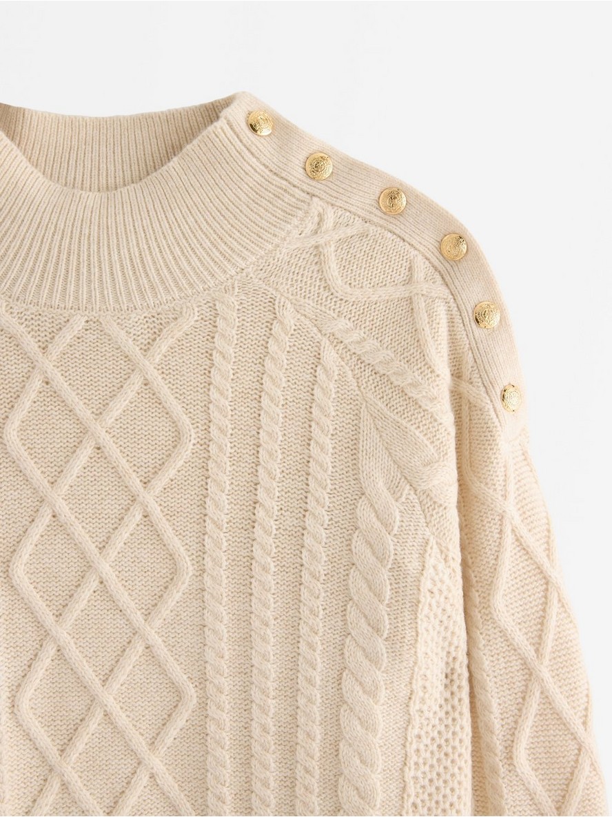 Pleteni džemper sa uzorkom od mekane mešavine vune — udoban i topao, sa polurolkom i dugmadima duž jednog ramena.