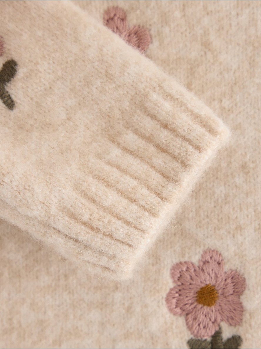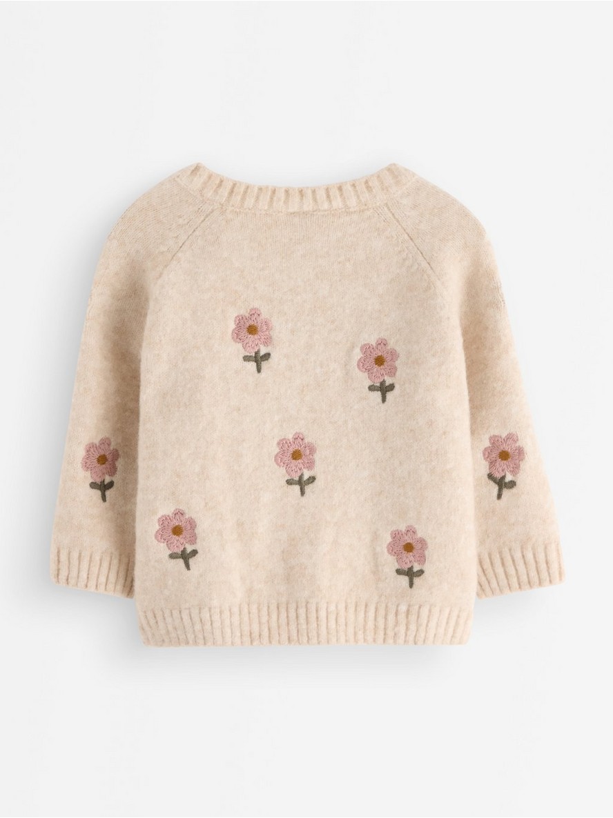 Mekan pleteni džemper sa izvezenim cvetovima i otvaranjem sa dugmetom na prednjem delu kod vrata.