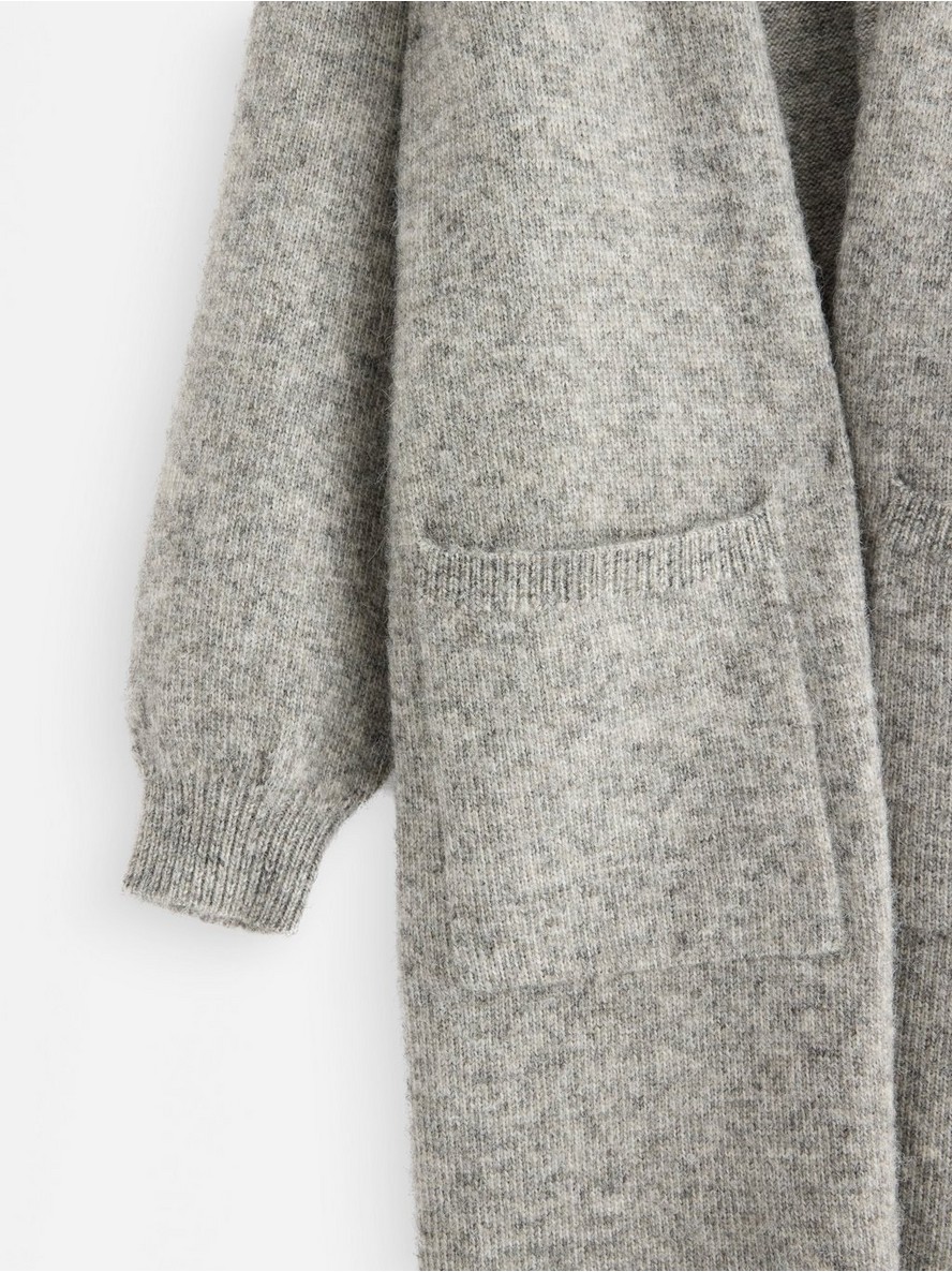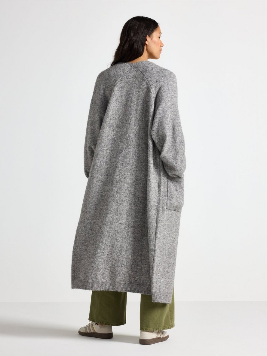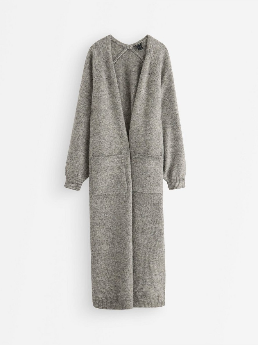 Dugi pleteni kardigan sa otvorenim prednjim delom i opuštenom siluetom.