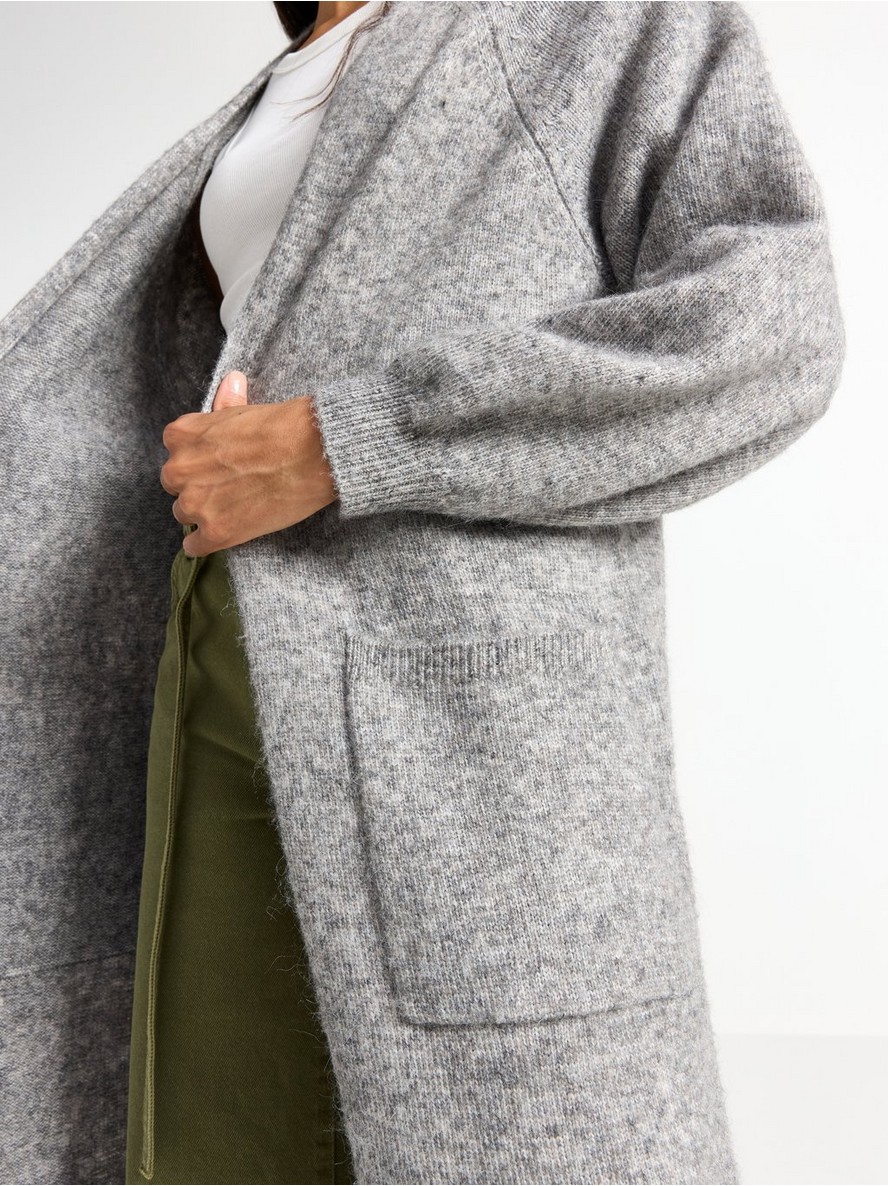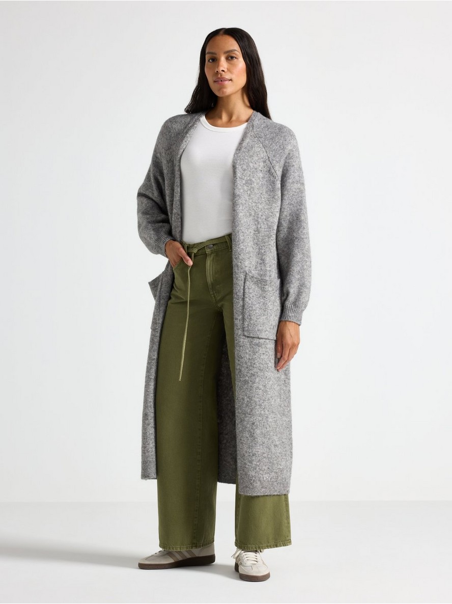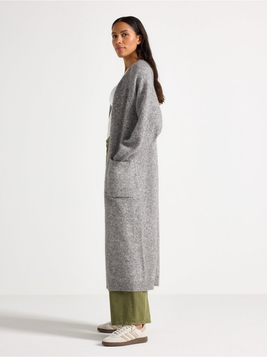Dugi pleteni kardigan sa otvorenim prednjim delom i opuštenom siluetom.
