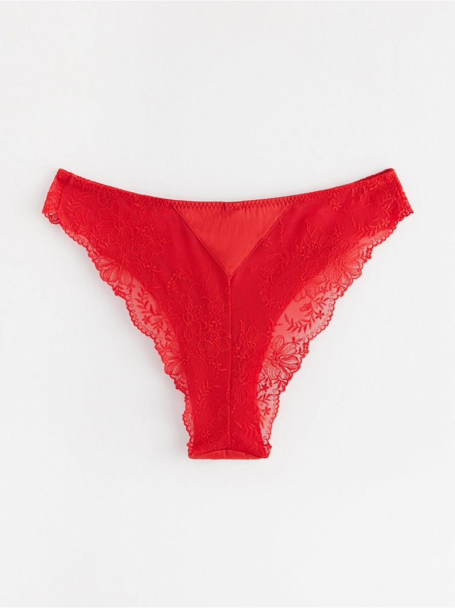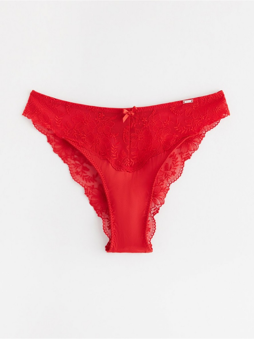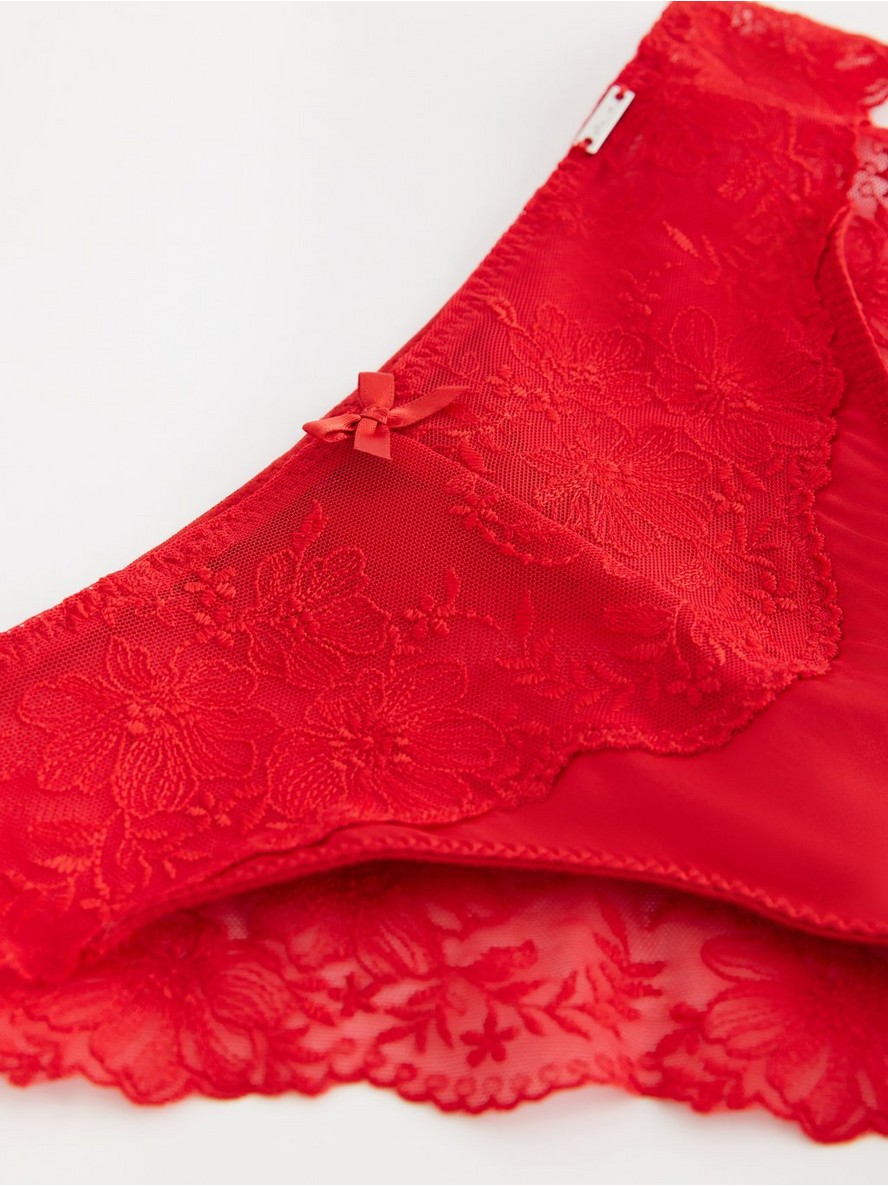 Klasične gaćice od mekog i rastegljivog satena, sa detaljima od čipke i malom ukrasnom mašnom na prednjoj strani.
