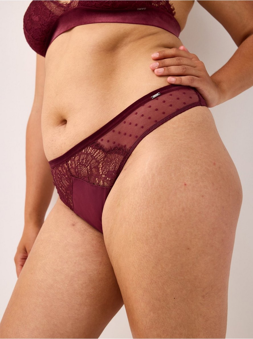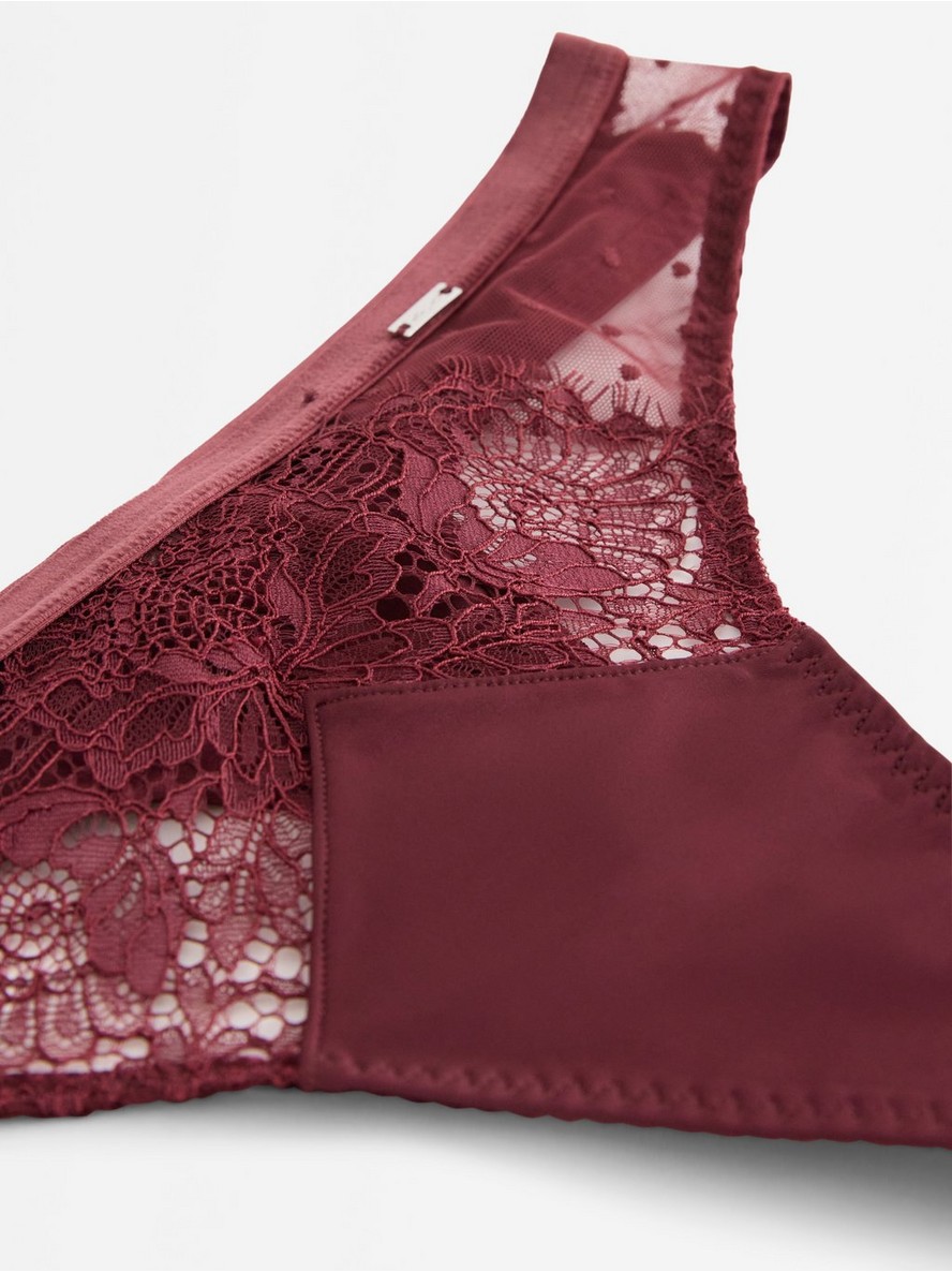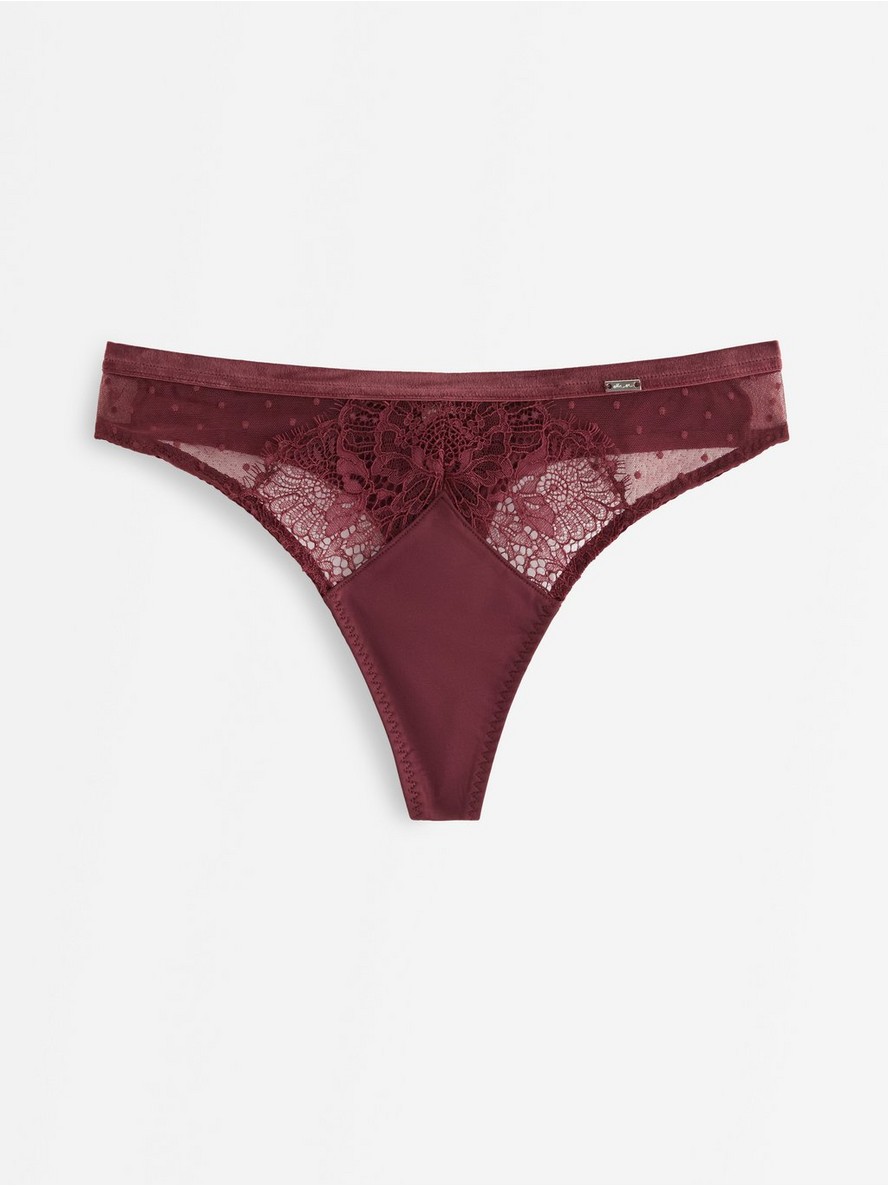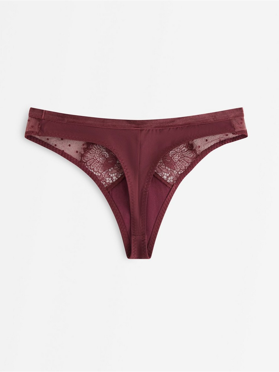 Tanga sa delikatnom čipkom i baršunastim detaljima.