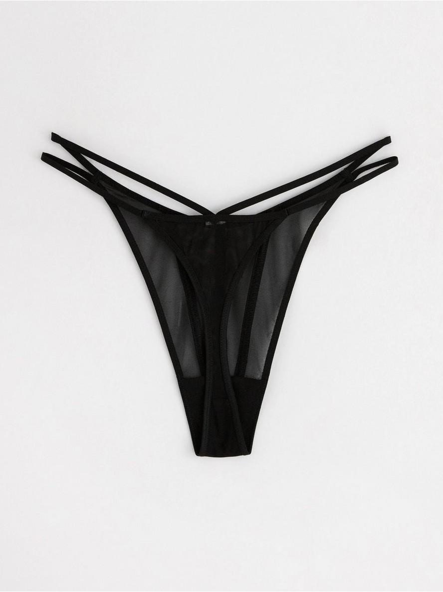 Tanga sa niskim strukom, izrađena od mekanog tila sa satenskim prugama na prednjem delu.