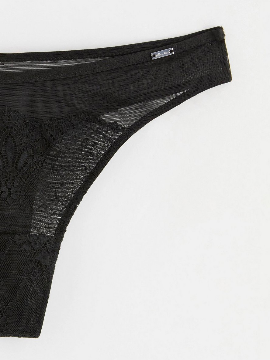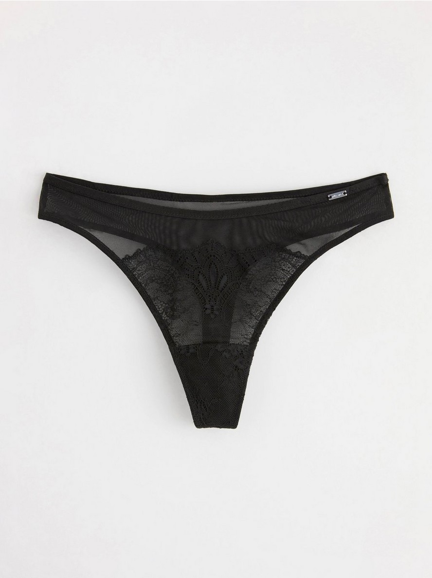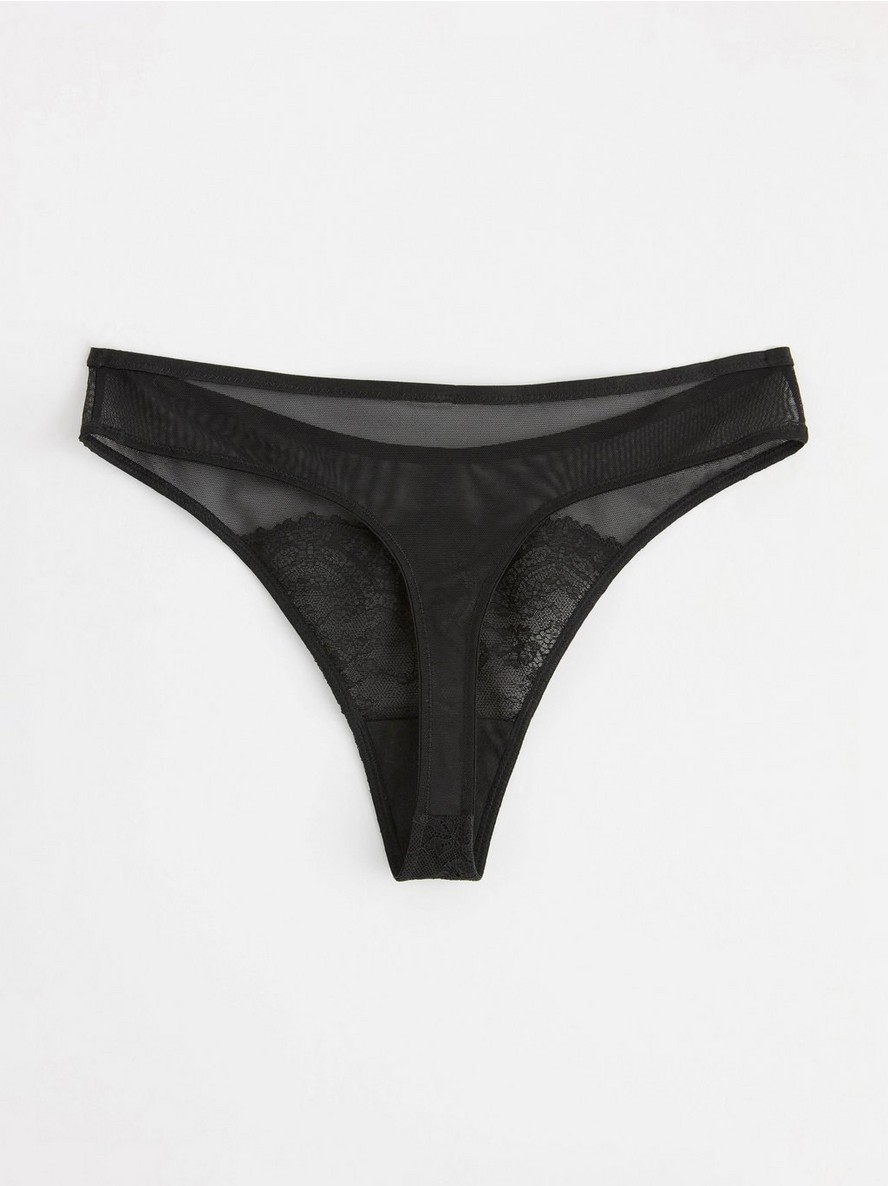 Tanga sa standardnim strukom i visokim izrezom nogu, izrađena od meke mrežaste tkanine sa čipkom.