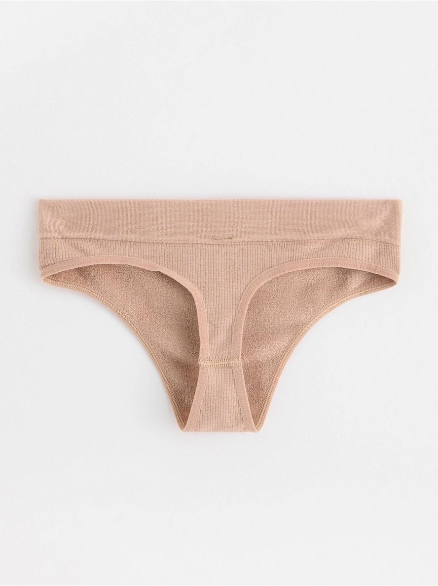 Bezšavska tanga sa srednjim strukom i visokim izrezima na nogama, izrađena od mekanog, rebrastog materijala.