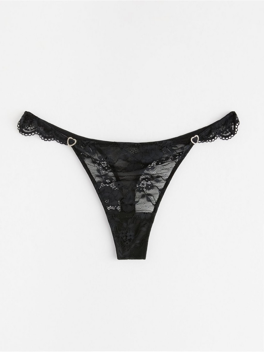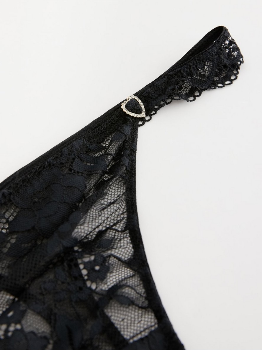 Tanga od čipke sa niskim strukom i visokim izrezom nogu.