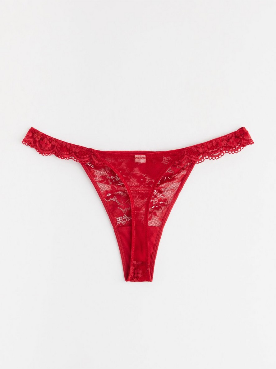 Tanga od čipke sa niskim strukom i visokim izrezom nogu.