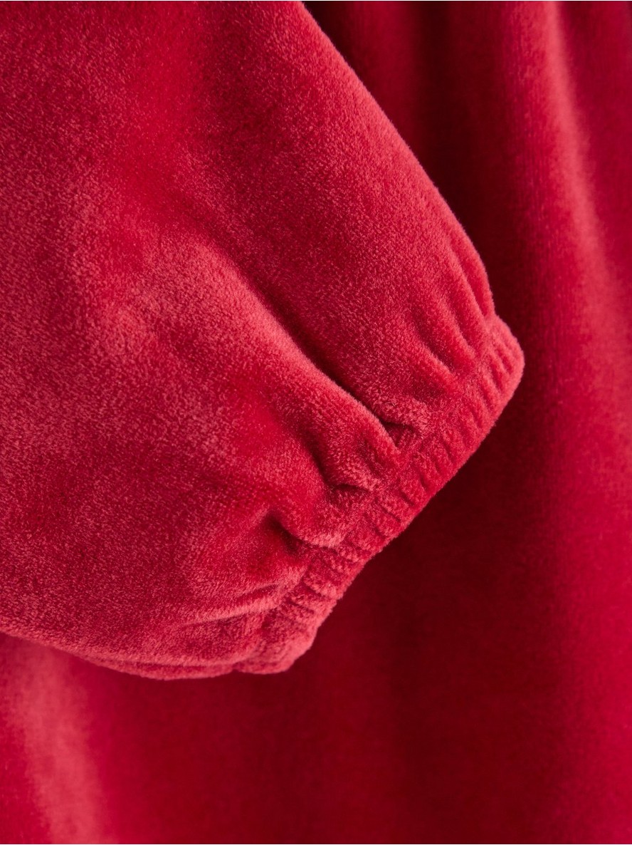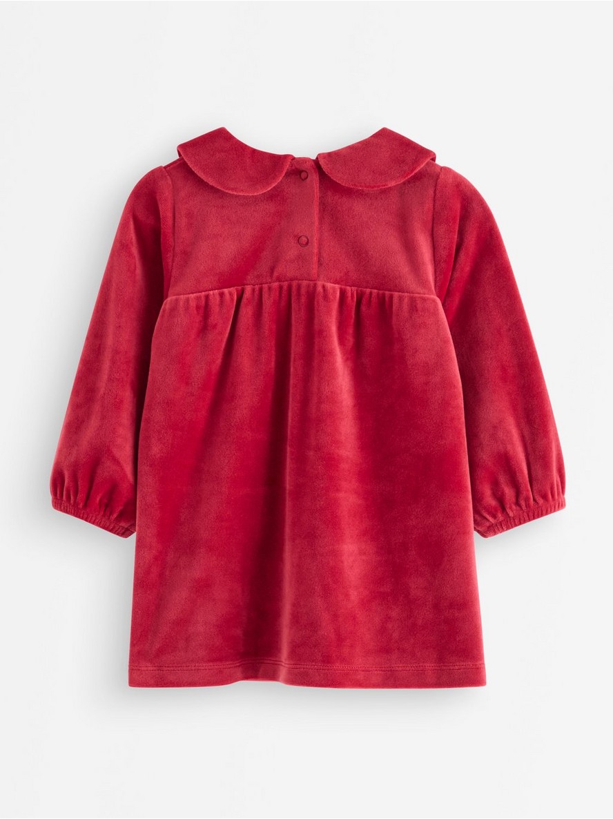 Mekana i udobna haljina od velura sa kragnom i dugim rukavima.