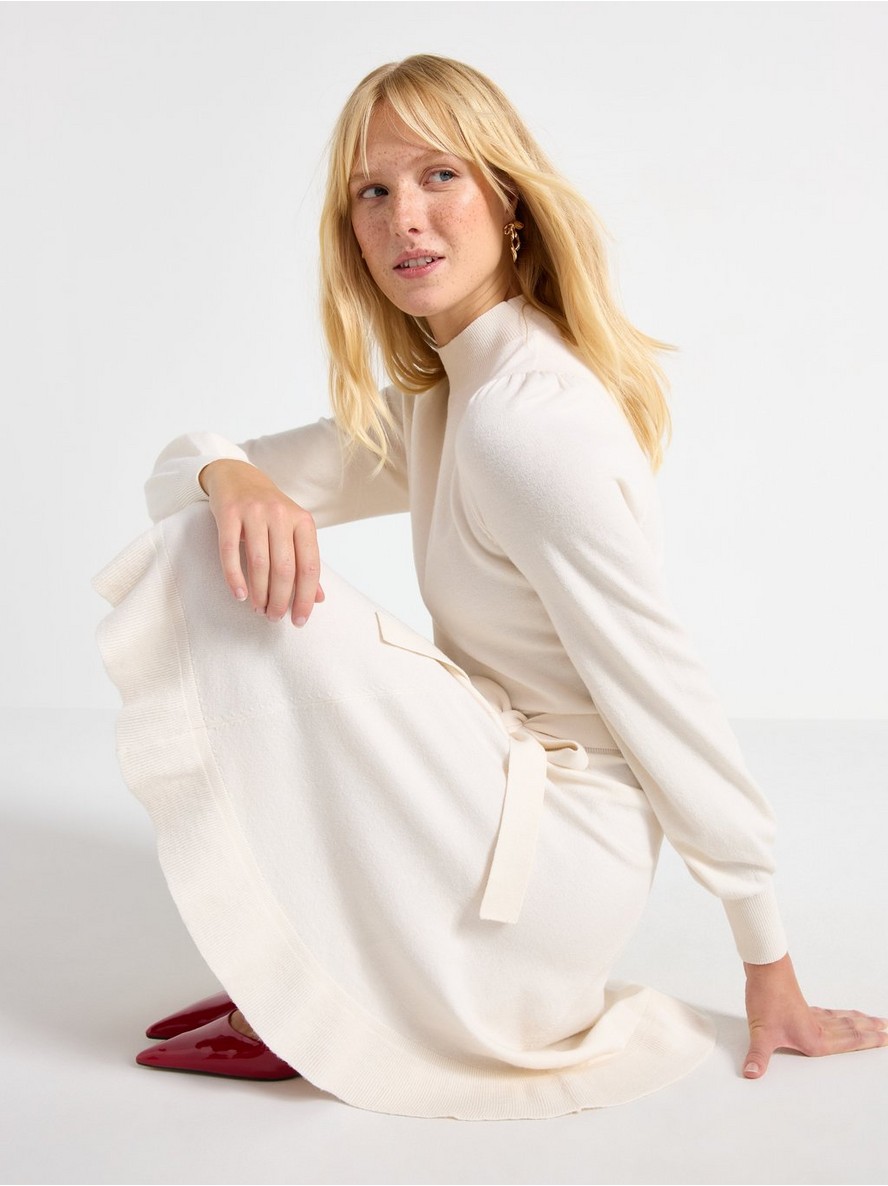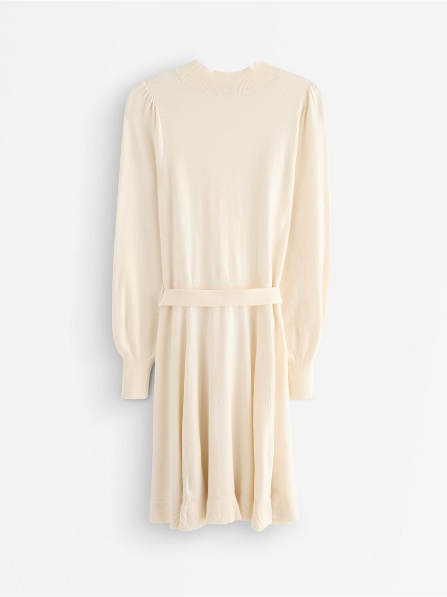 Fino pletena mini haljina sa dugim rukavima i pojasom za vezivanje u struku.