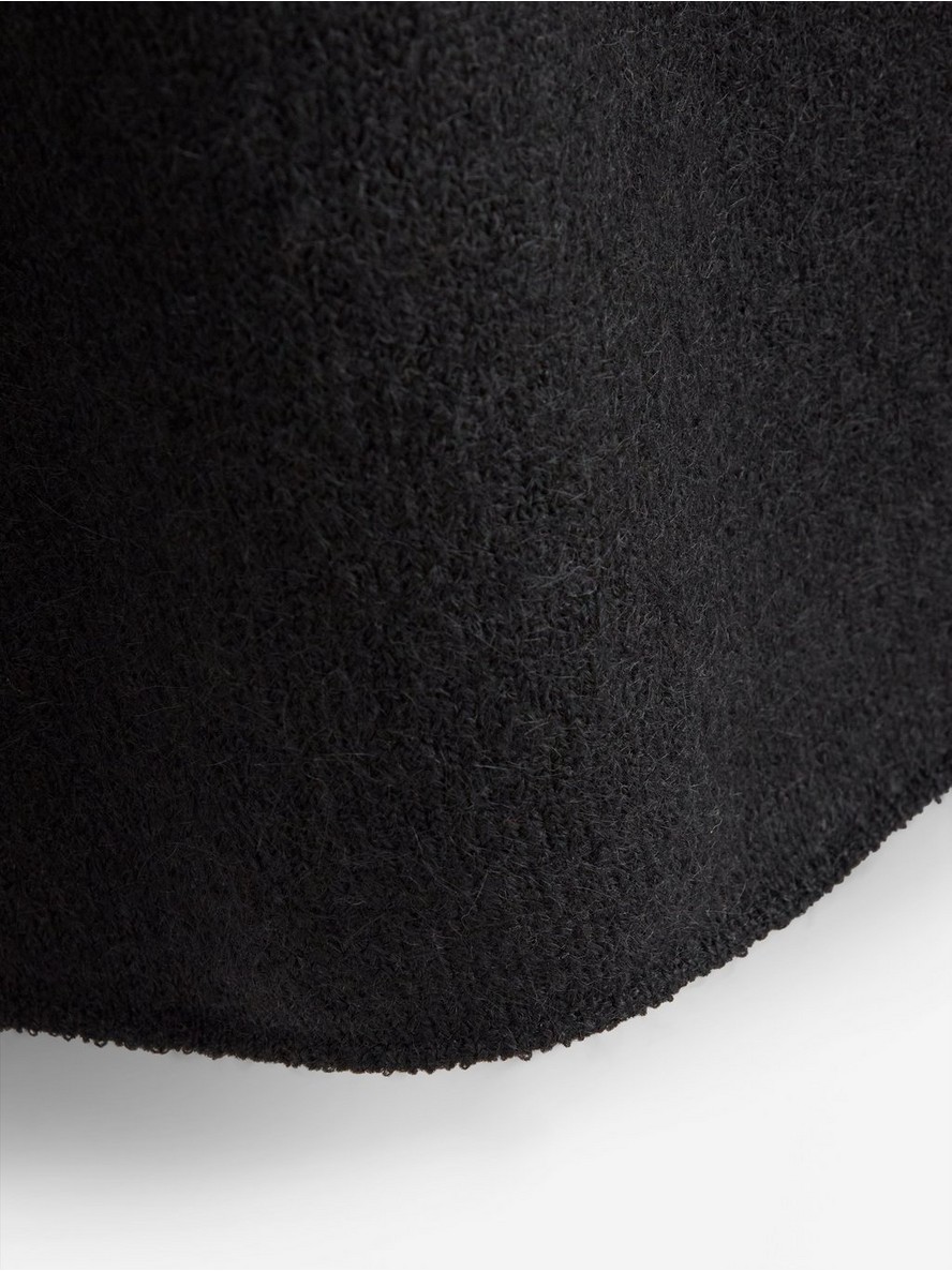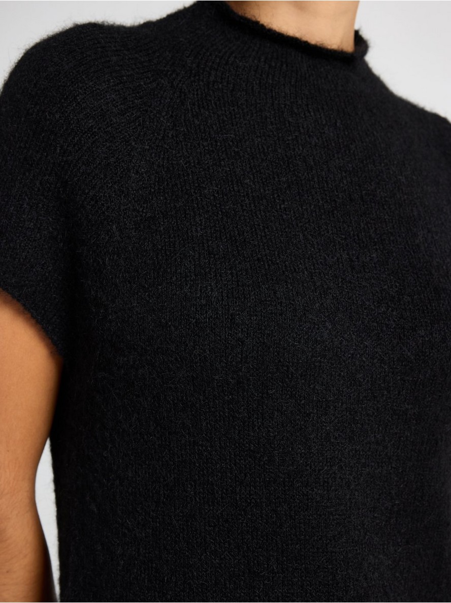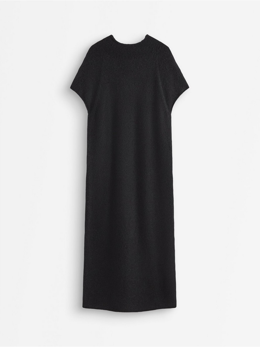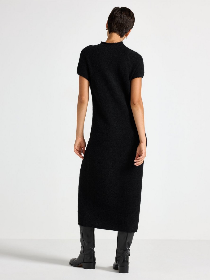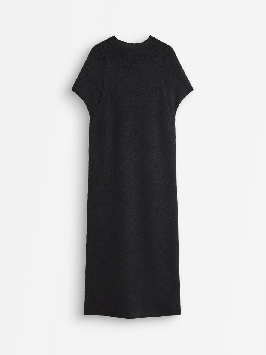 Mekana, pletena midi haljina sa ravnom siluetom, kratkim rukavima i stojećim ovratnikom.
