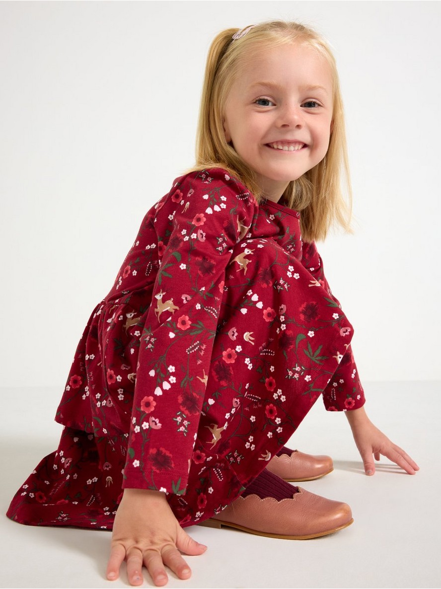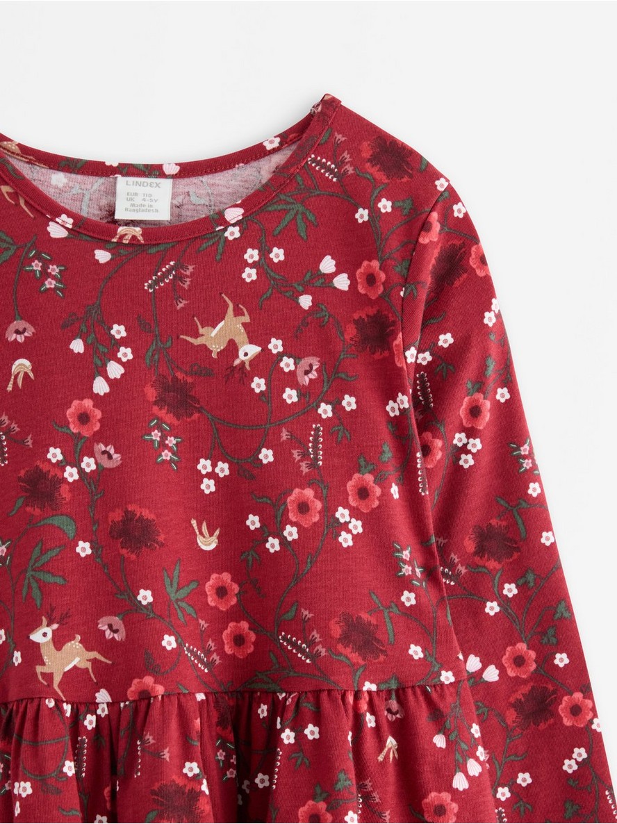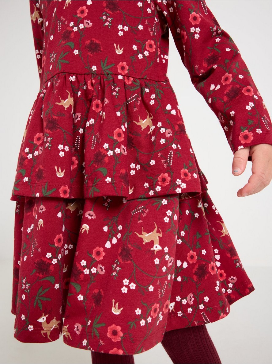 Mekana pamučna haljina sa dugim rukavima i suknjom sa volanima.