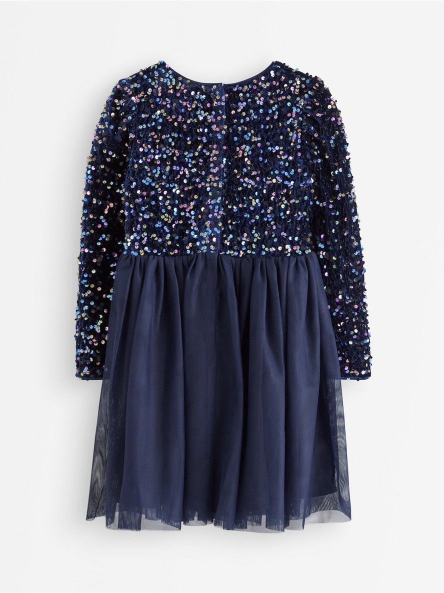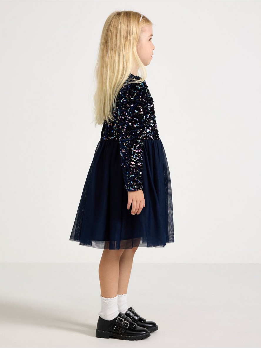 Svečana haljina dugih rukava sa gornjim delom od šljokica i baršuna i suknjom od tila.