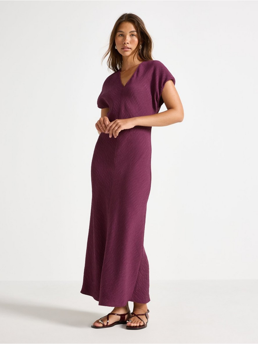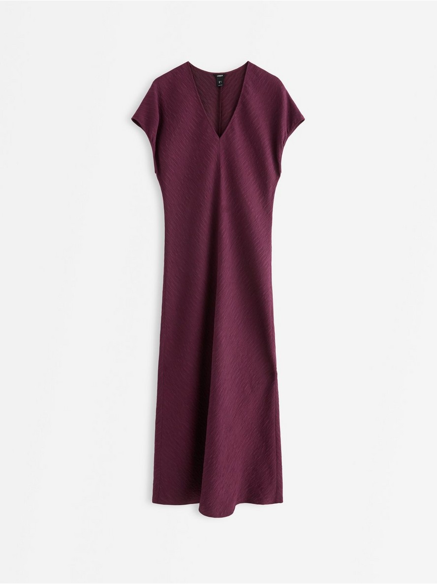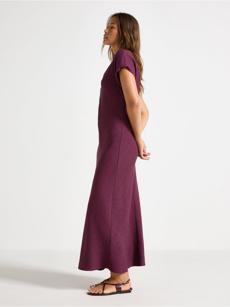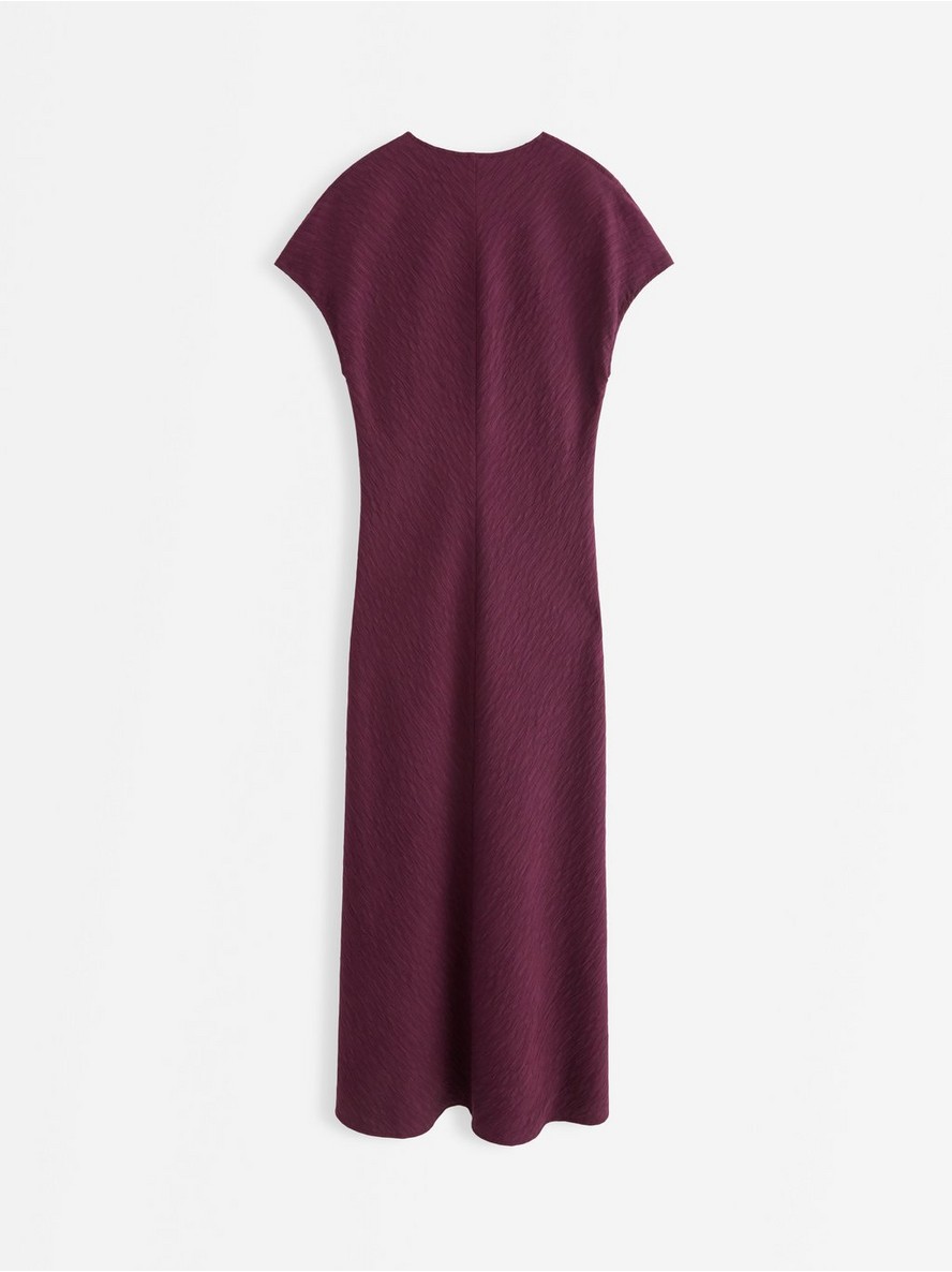 Tkana midi haljina od strukturiranog materijala, sa krojem koji prati liniju tela.