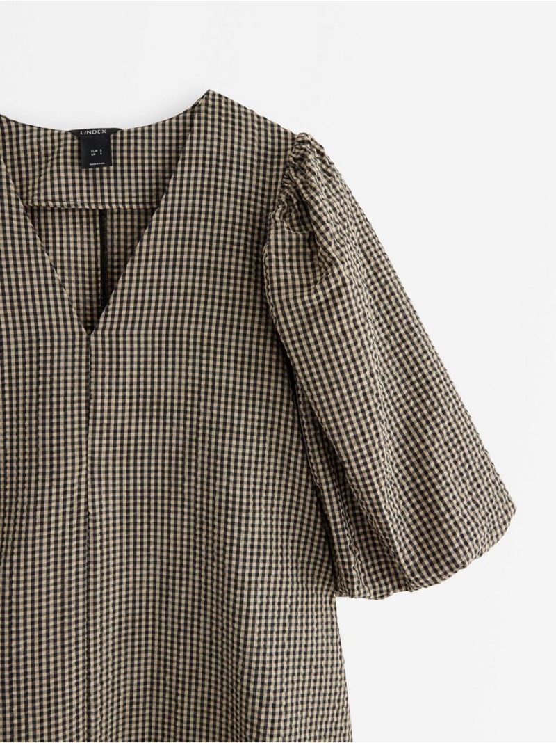 Midi haljina od seersucker tkanine, opuštenog kroja sa puf rukavima.